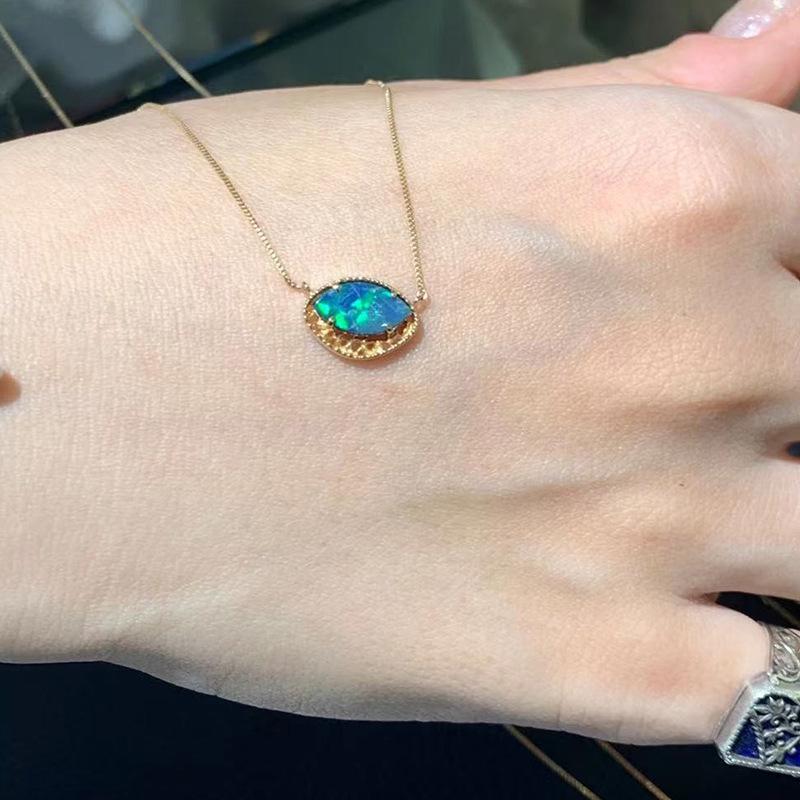 项链气质潮日式银s925静谧森林橄榄形蓝色欧泊马眼猫眼蛋白石镂空