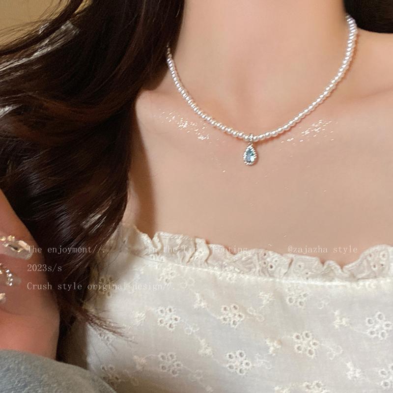 蓝色水滴珍珠锁骨链女夏轻奢小众设计颈链2025新款爆款高级感项链