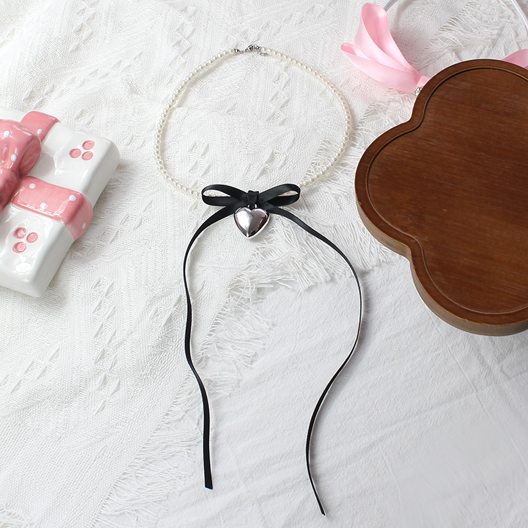 黑色长款飘带丝带锁骨链项链爱心Y2K甜酷辣妹仿珍珠龙心原创手作