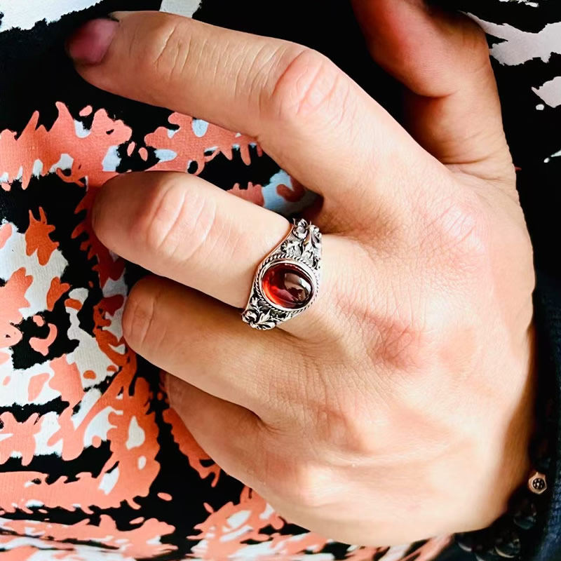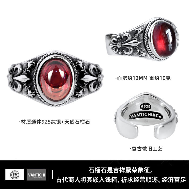 [吉祥财富]小众复古VANTICHI纯银石榴石红色宝石活口戒指男女尾戒