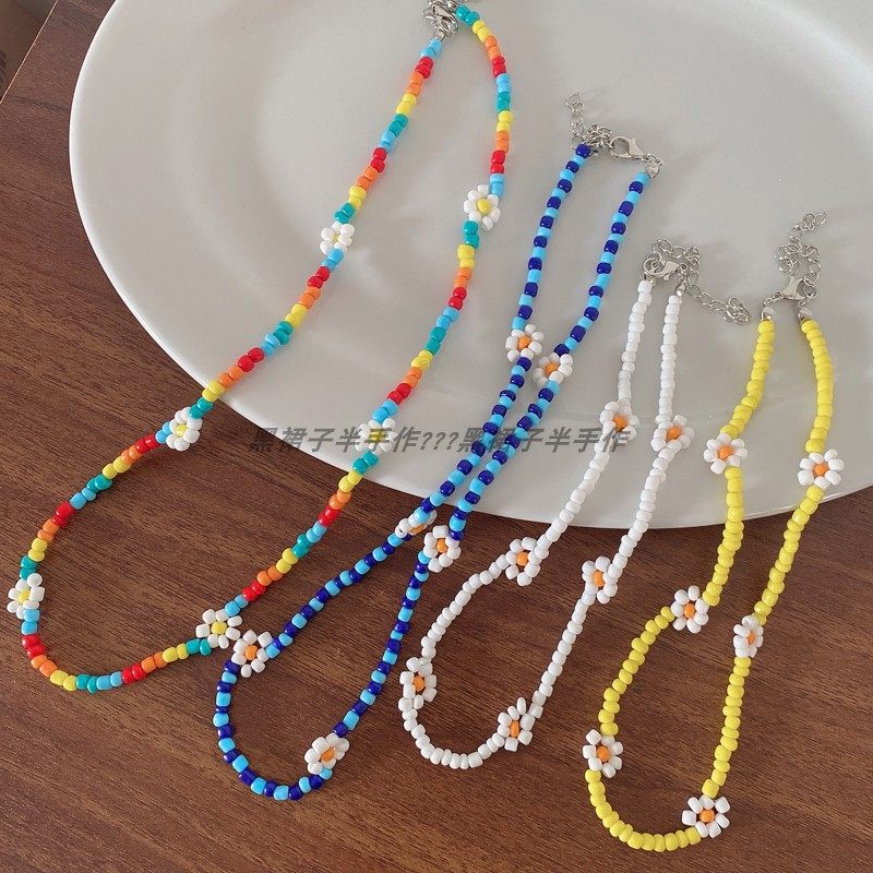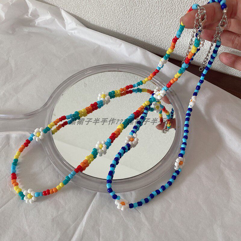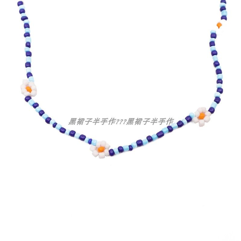 夏天的风~彩虹米珠项链蓝白色小清新花朵手工编织脖子链叠戴颈链