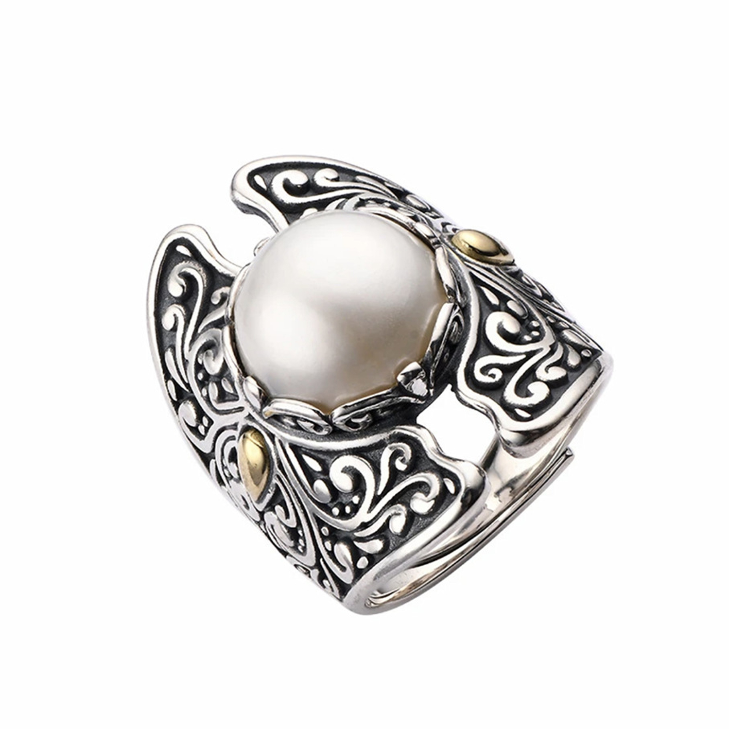 复古盾牌珠珠戒指女新中式做旧时尚宽版浮雕唐草纹开口可调节指环