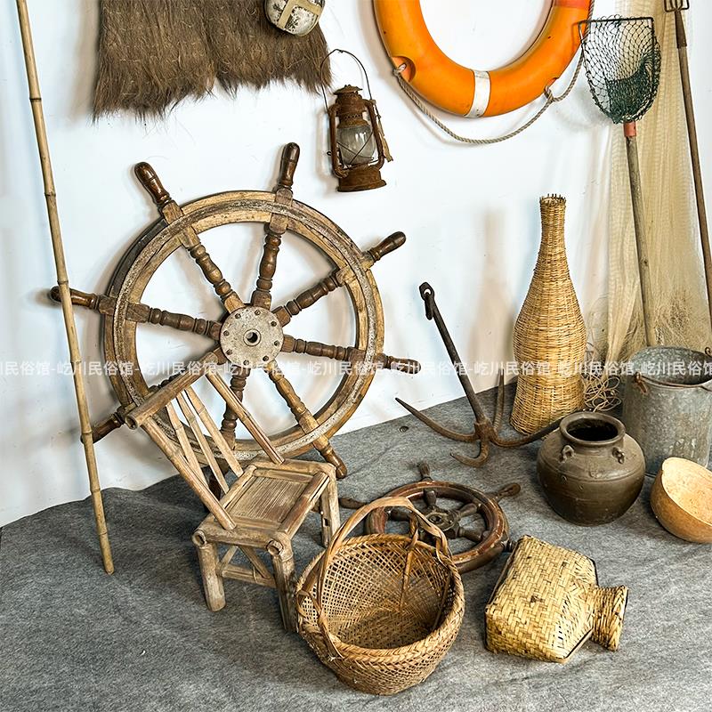 八十年代民俗老物件打渔工具渔网渔具舵轮鱼篓渔文化展览装饰摆设