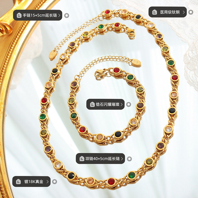 欧美时尚小众鱼眼设计多彩锆石拼接链子项链手链钛钢镀金首饰套装