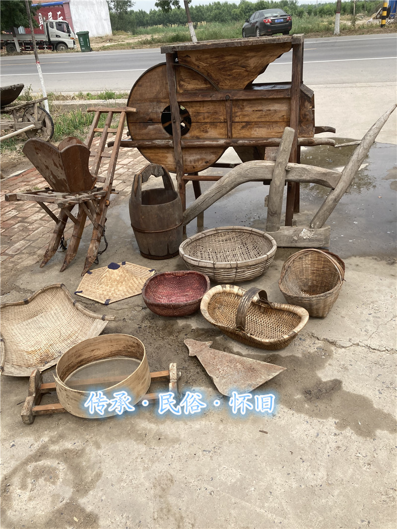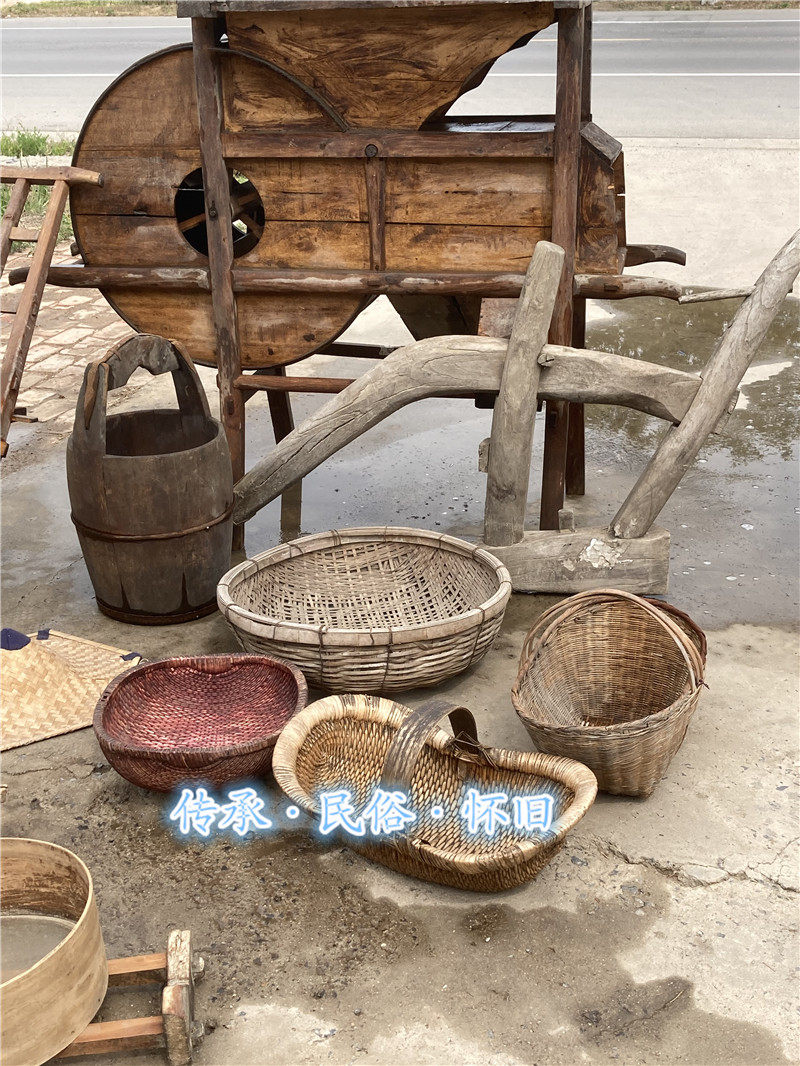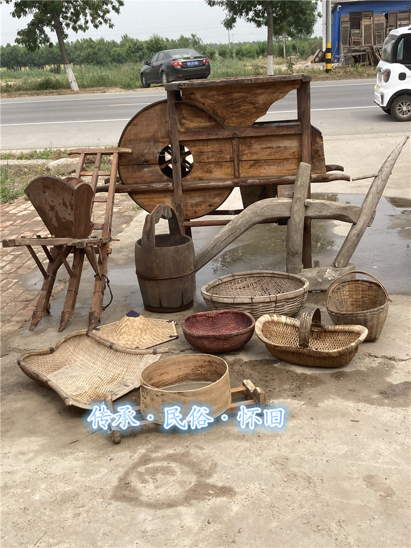 民俗怀旧老物件农耕文化展览旧农具老风车牛拉木犁播种机扁担秤杆