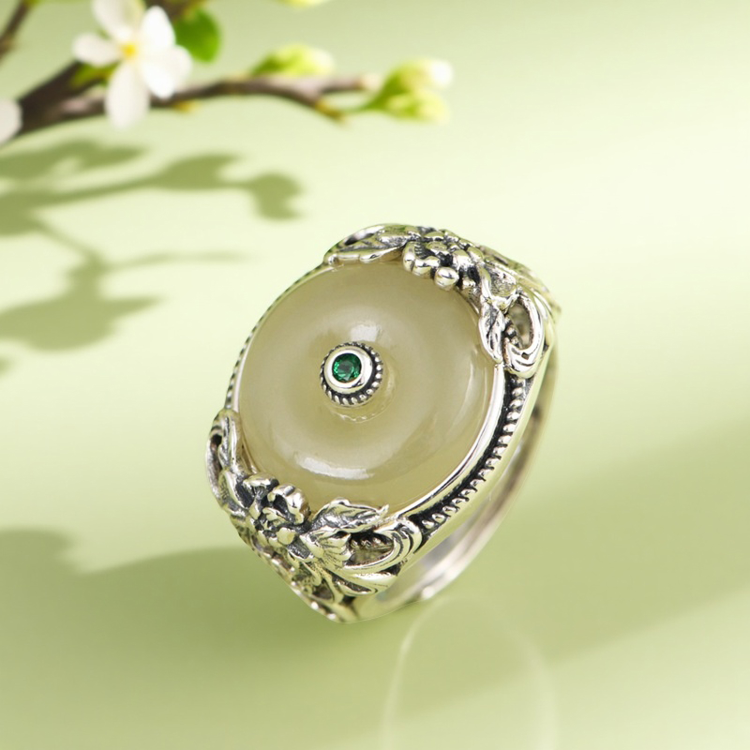 牡丹花平安扣戒指女款新中式国风高级感复古青玉石指环活口食指戒