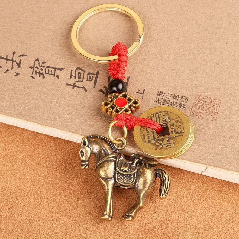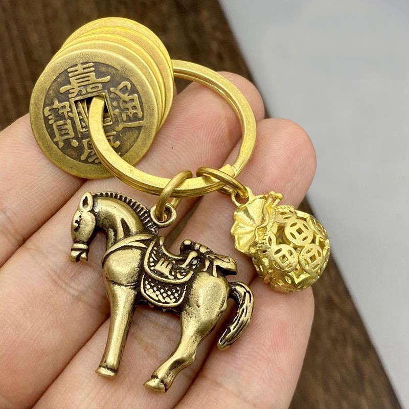 纯黄铜马上赢五帝钱钥匙挂件招财钱袋生财转运平安男女编绳吊坠