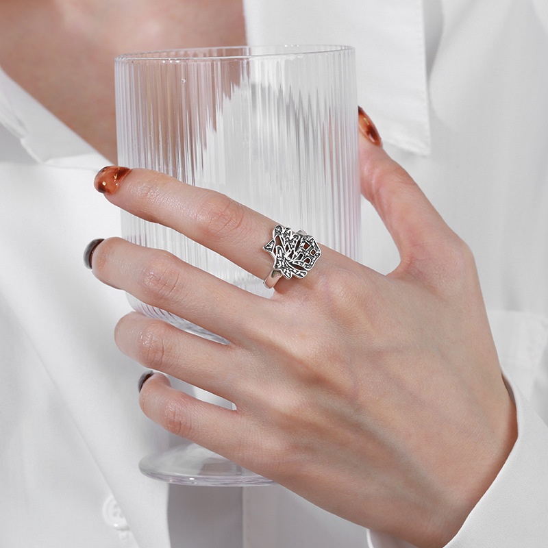美汝仙 s925纯银复古树叶图案福字指环生机勃勃福气寓意开口戒指