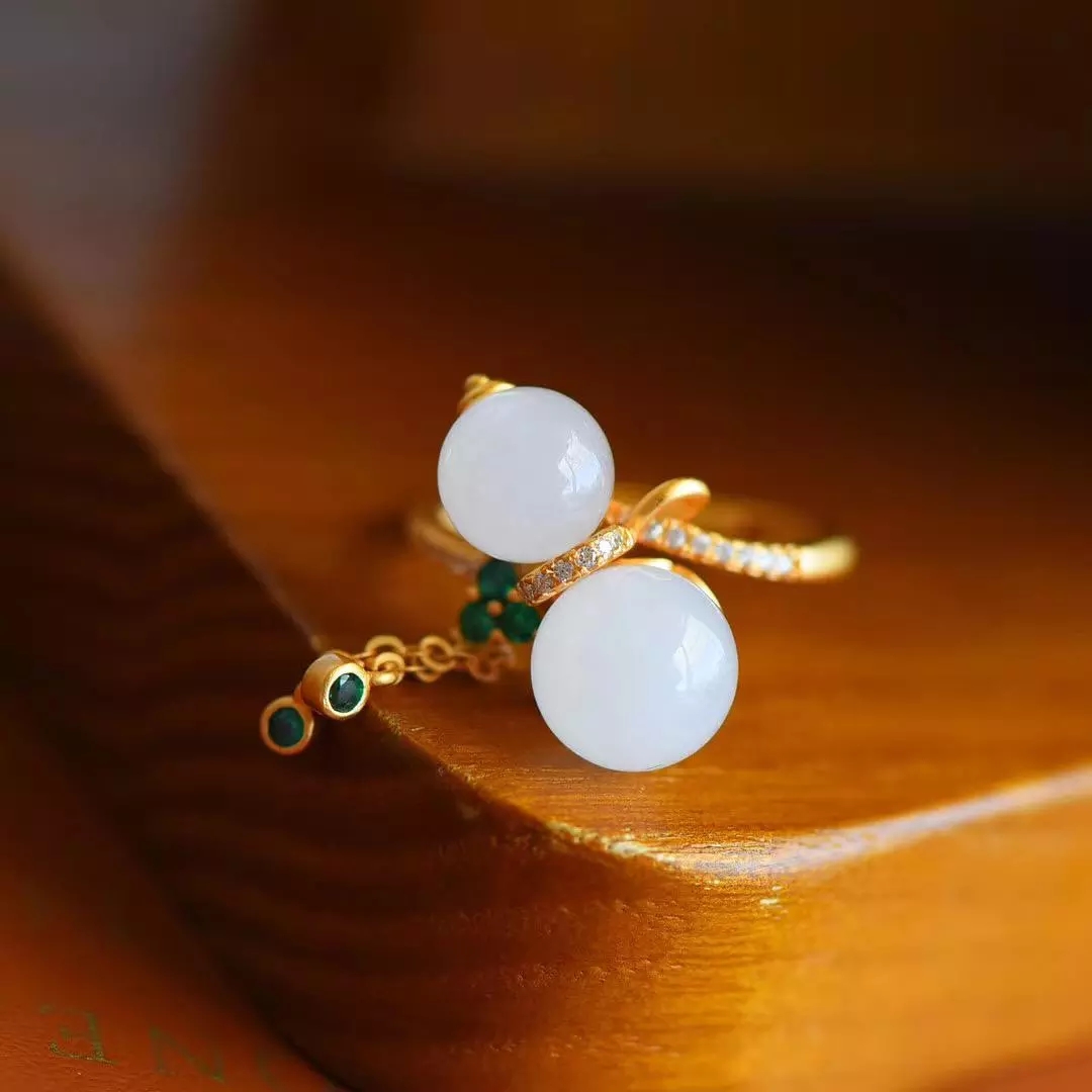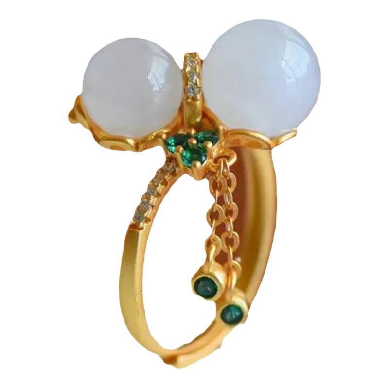 白玉羊脂玉圆珠戒指S925银镀古法金绿锆石指环宫廷风流苏女款