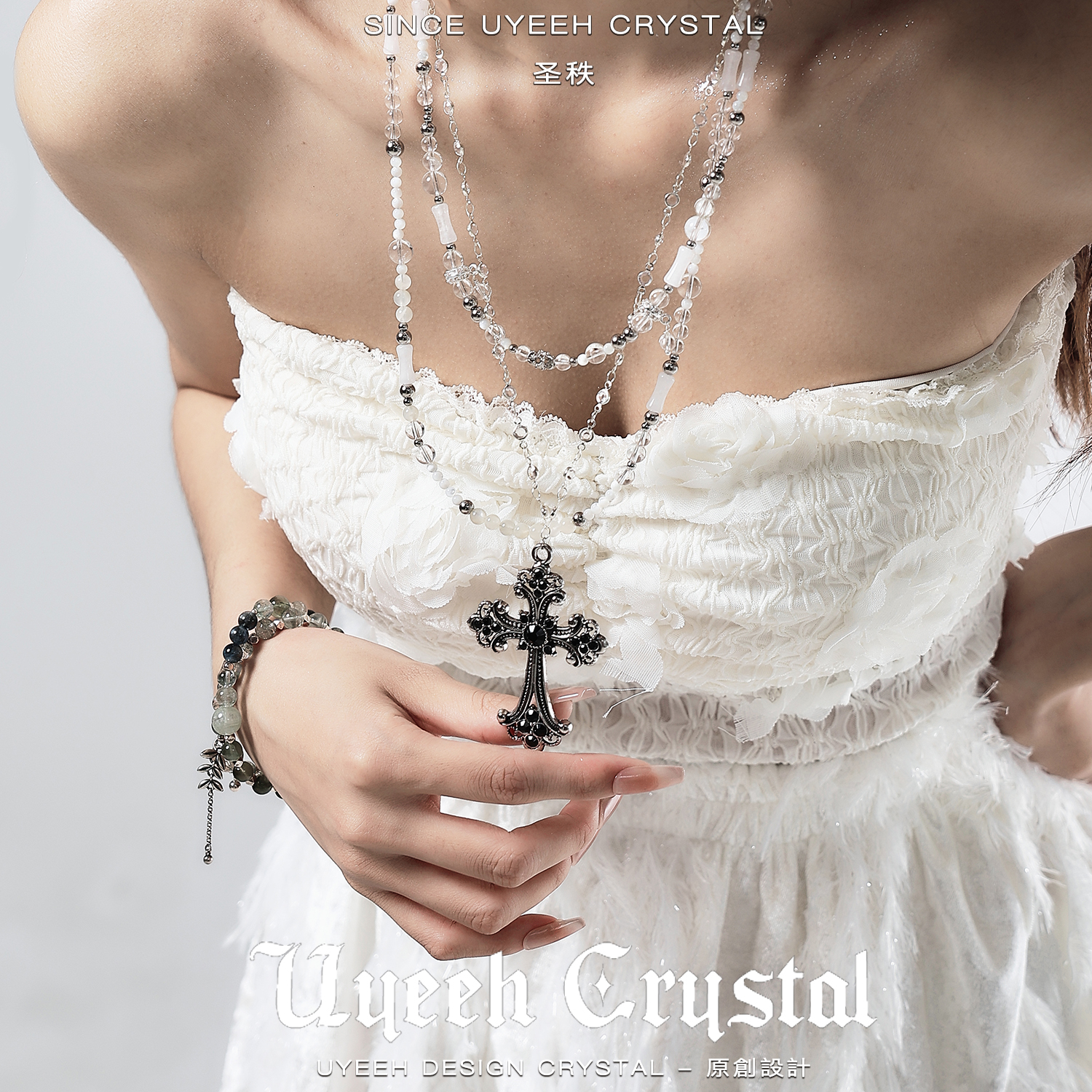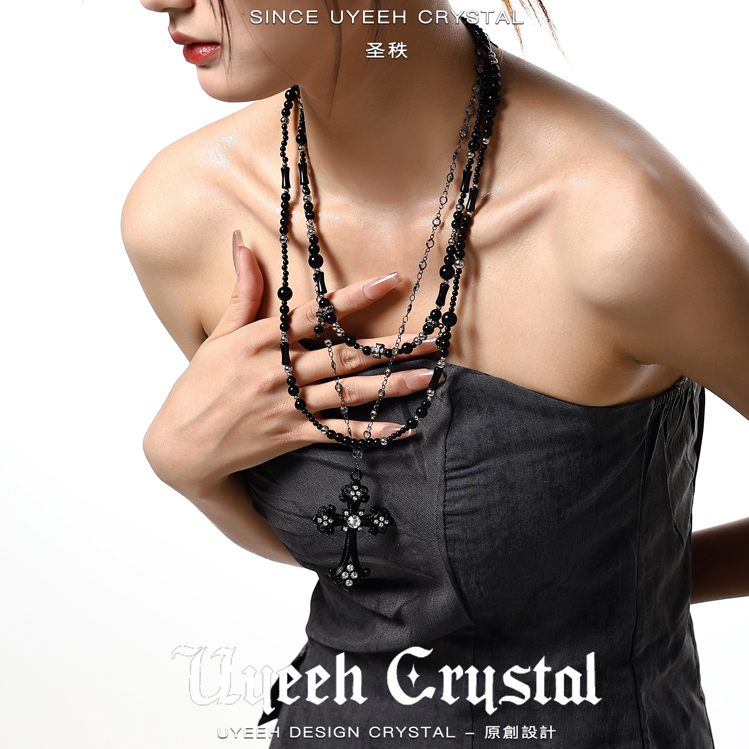 【圣秩】天然黑曜石白水晶十字架叠戴多层项链毛衣链小众设计感