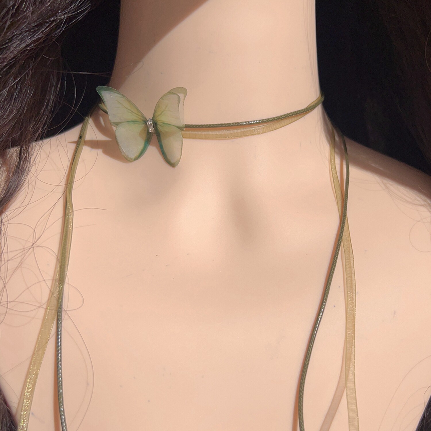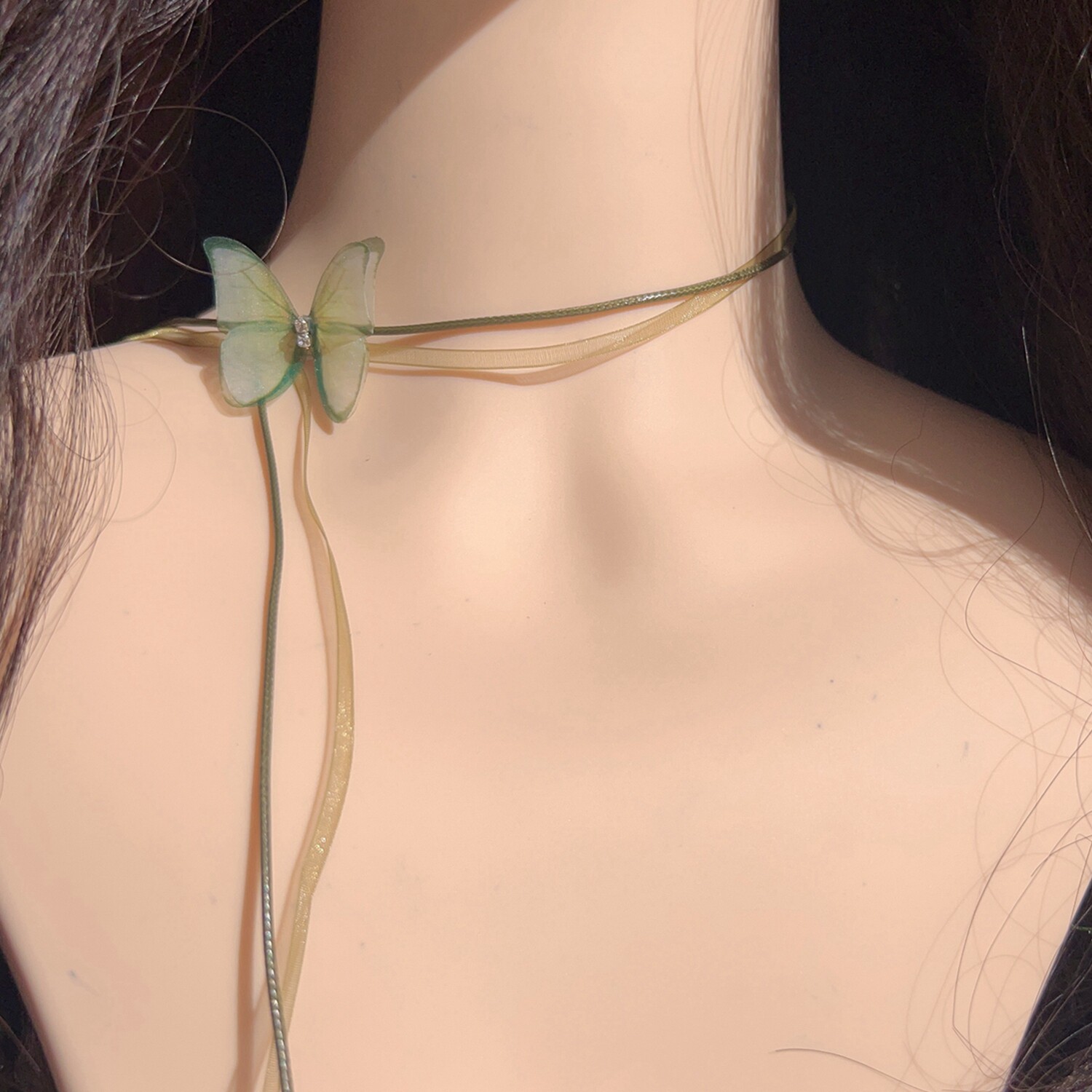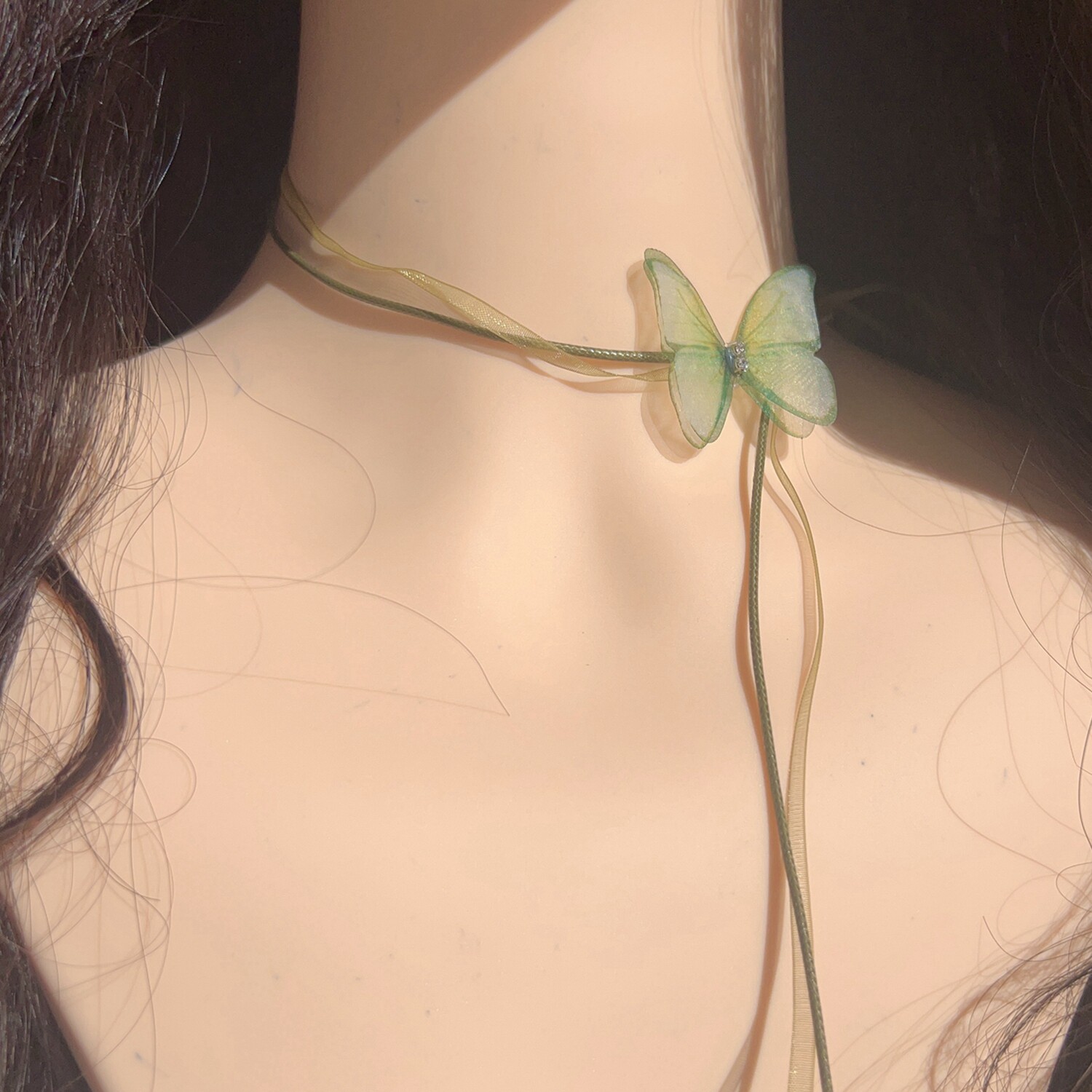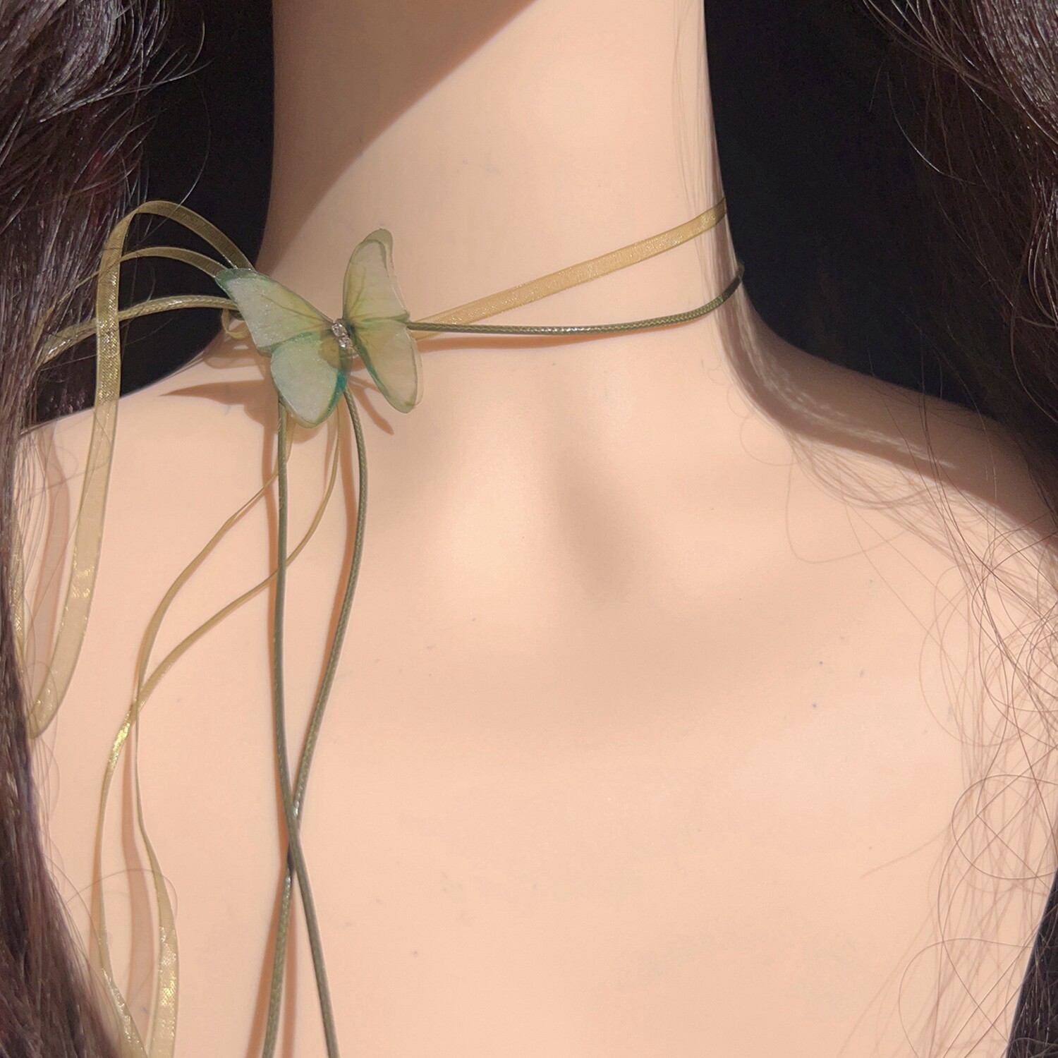 小众设计超仙气绿色薄纱蝴蝶长款绑带项圈颈带气质项链choker