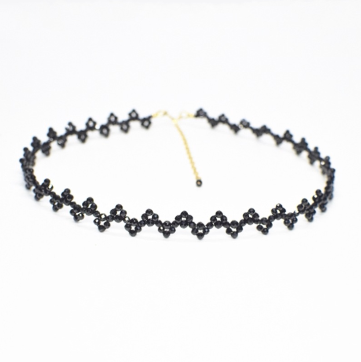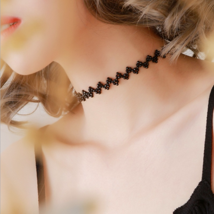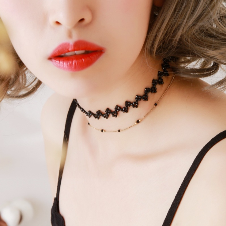 天然黑色尖晶石14K注金波浪蕾丝项链项圈chocker女锁骨链颈链超闪