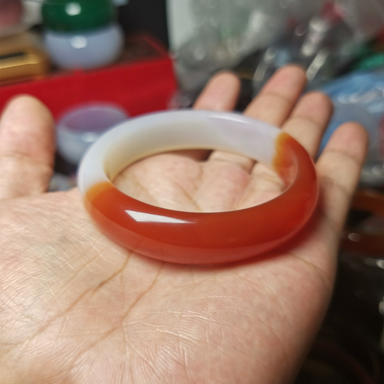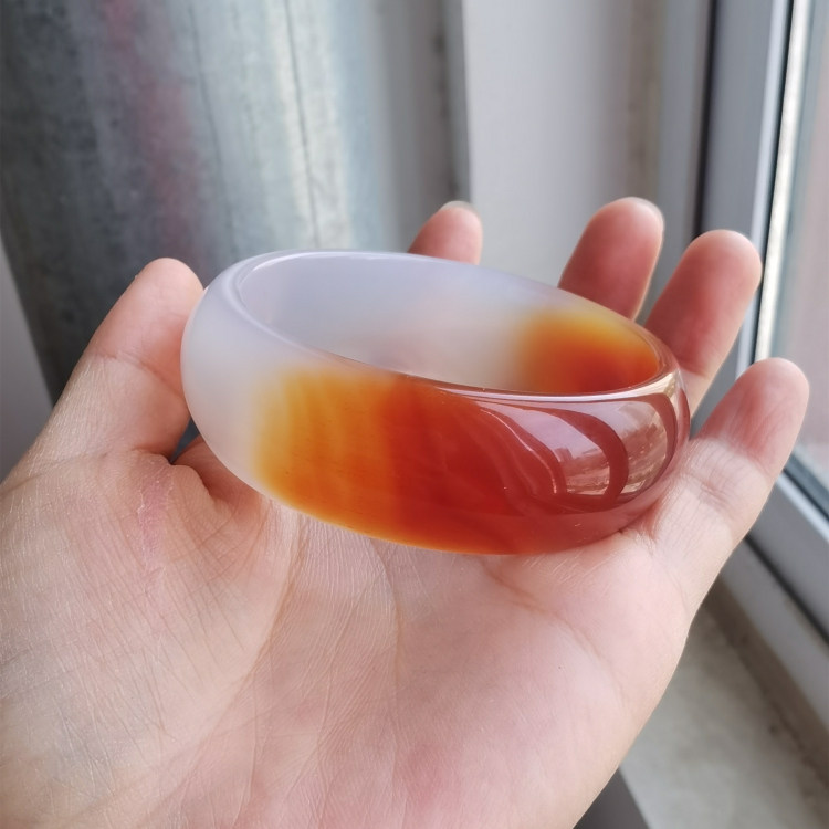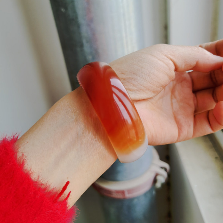 天然正品半红半白红玛瑙手镯女款加宽加厚红色玉髓冰种宽版玉镯子