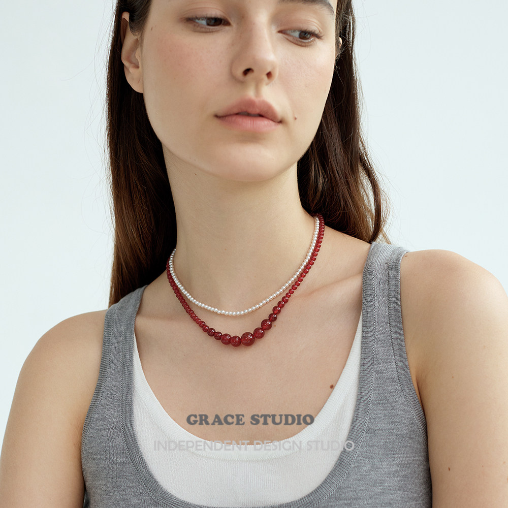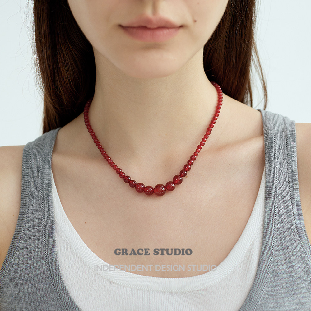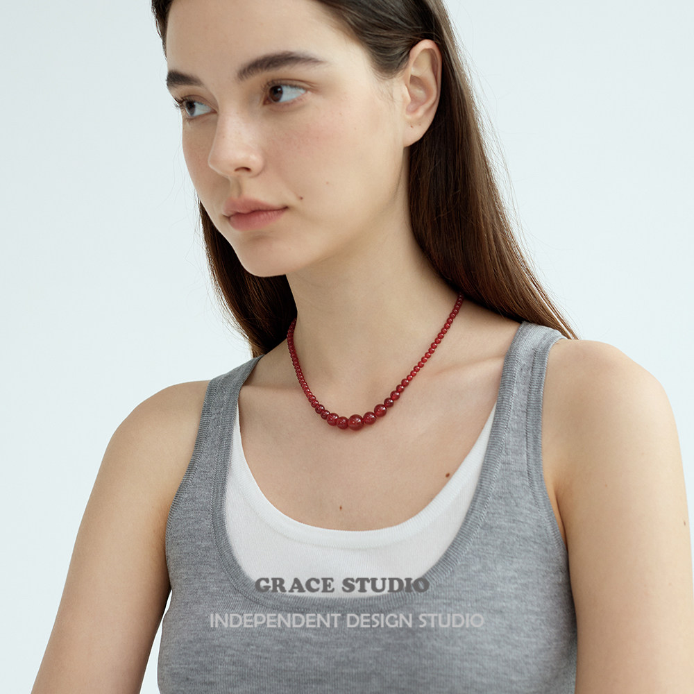 G/S波尔图 高级感渐变红玛瑙串珠项链女复古新中式休闲红色项链