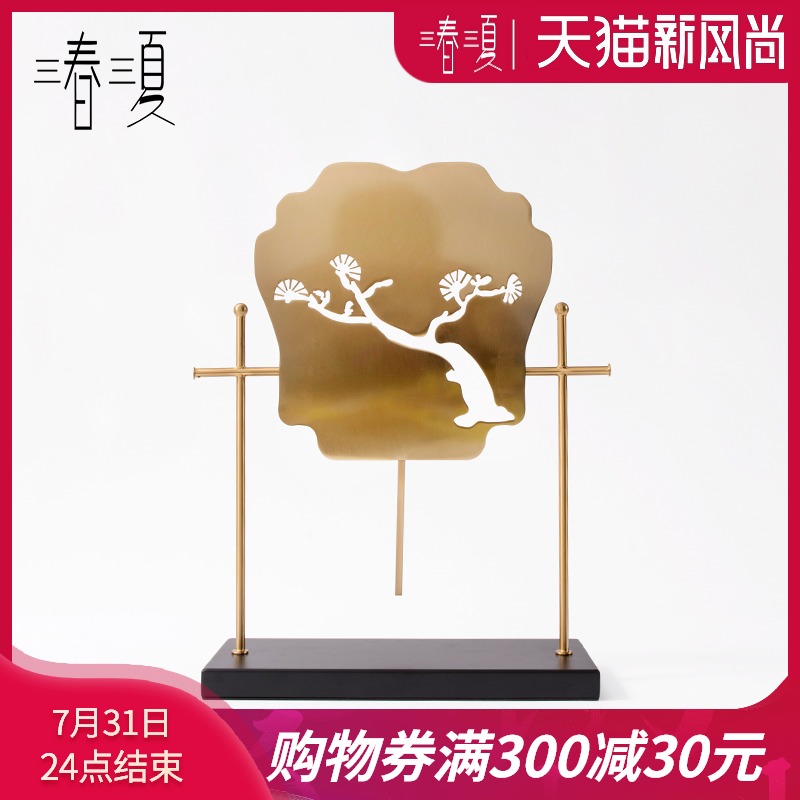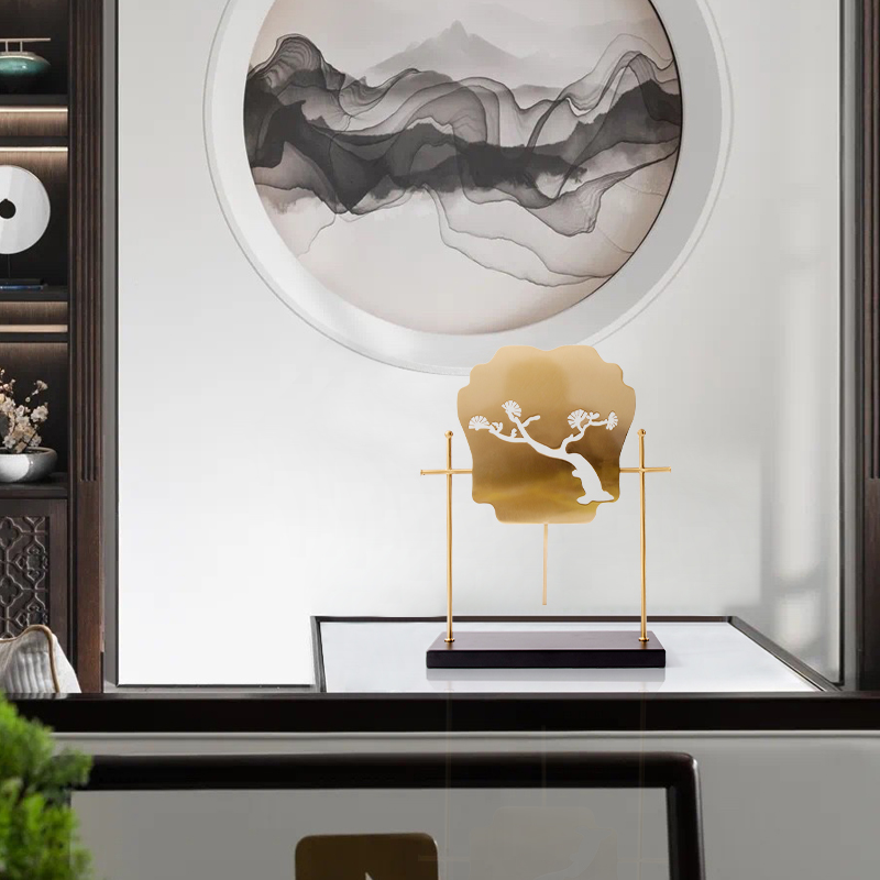 新中式金属迎客松扇子摆件样板间别墅禅意博古架客厅玄关软装饰品
