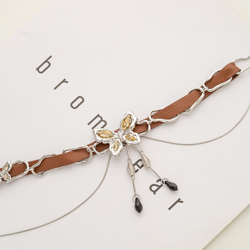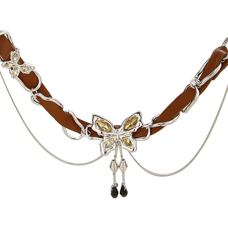 美拉德棕色皮革水晶蝴蝶项链女choker高级感颈链项圈锁骨链配饰