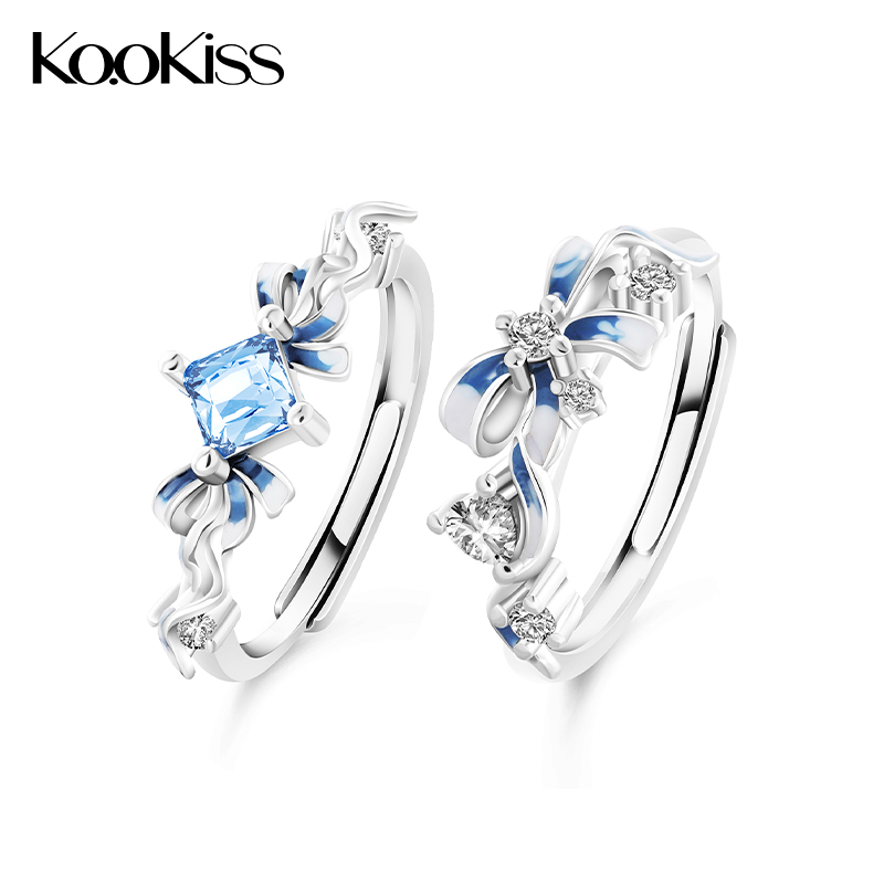 KOOKISS梦舞流苏 蝴蝶结闺蜜对戒轻奢清透蓝钻纯银二人友谊戒指
