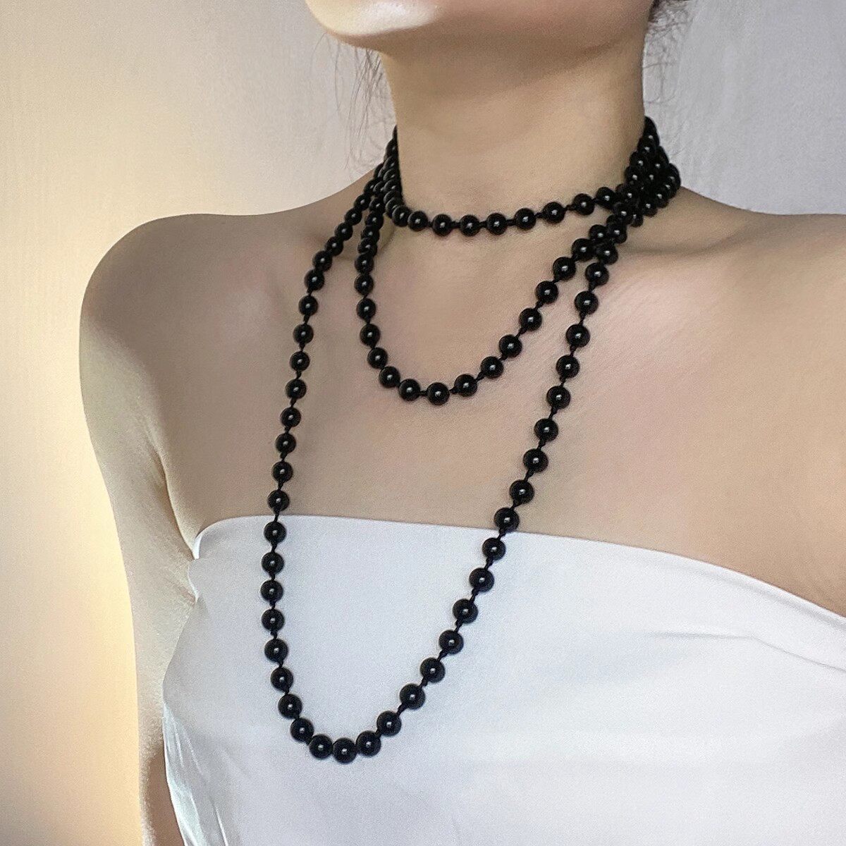 国风复古黑色圆珠珍珠项链女长款多层叠戴名媛旗袍颈链轻奢锁骨链