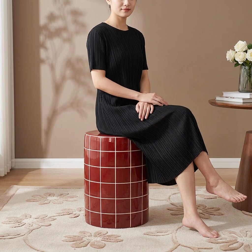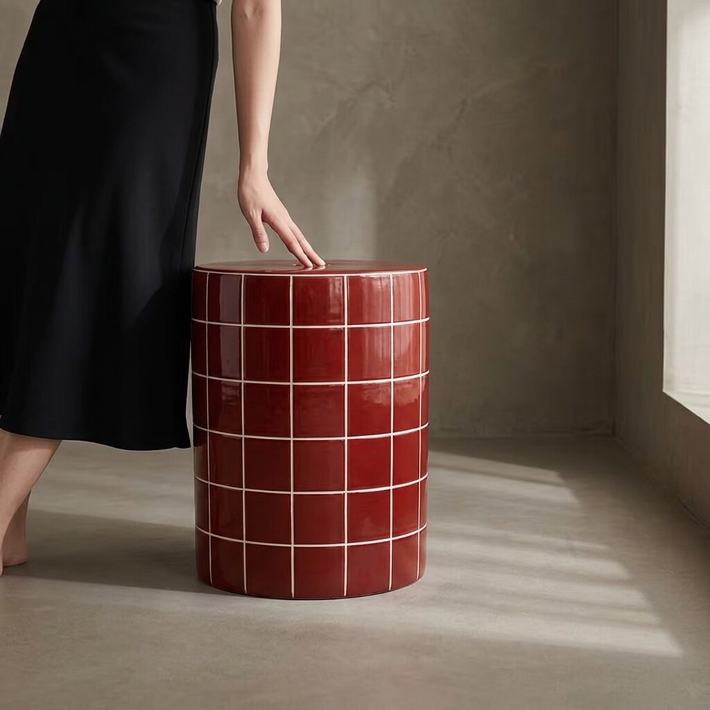 现代简约圆形陶瓷花瓶红色格子装饰摆件客厅卧室家居饰品