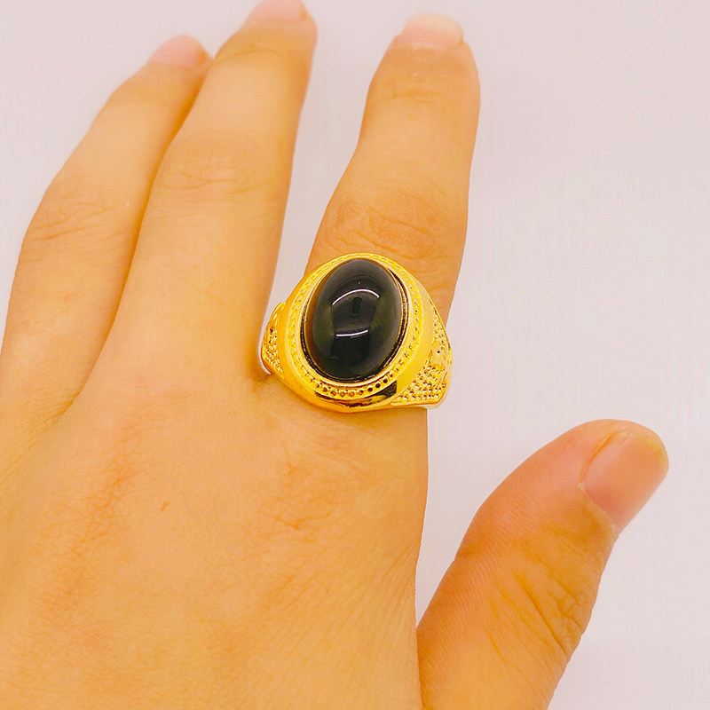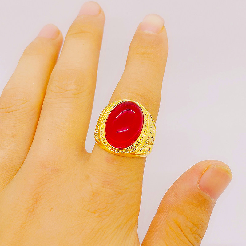 仿真越南沙金戒指男红玛瑙霸气指环24k铜镀金镶嵌宝石18K黄金首饰