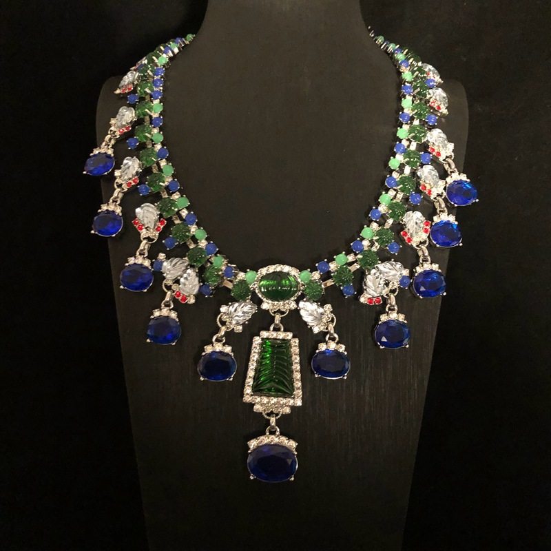 中古重工蓝色莱茵石项链耳环套装女高订欧美夸张气质项链耳夹
