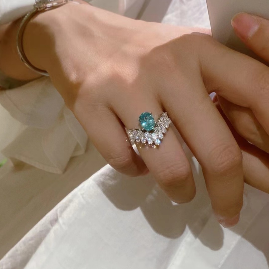 珠宝感2.2克拉鸽子蛋形帕拉伊巴V形钻石戒指女925纯银轻奢有荧光