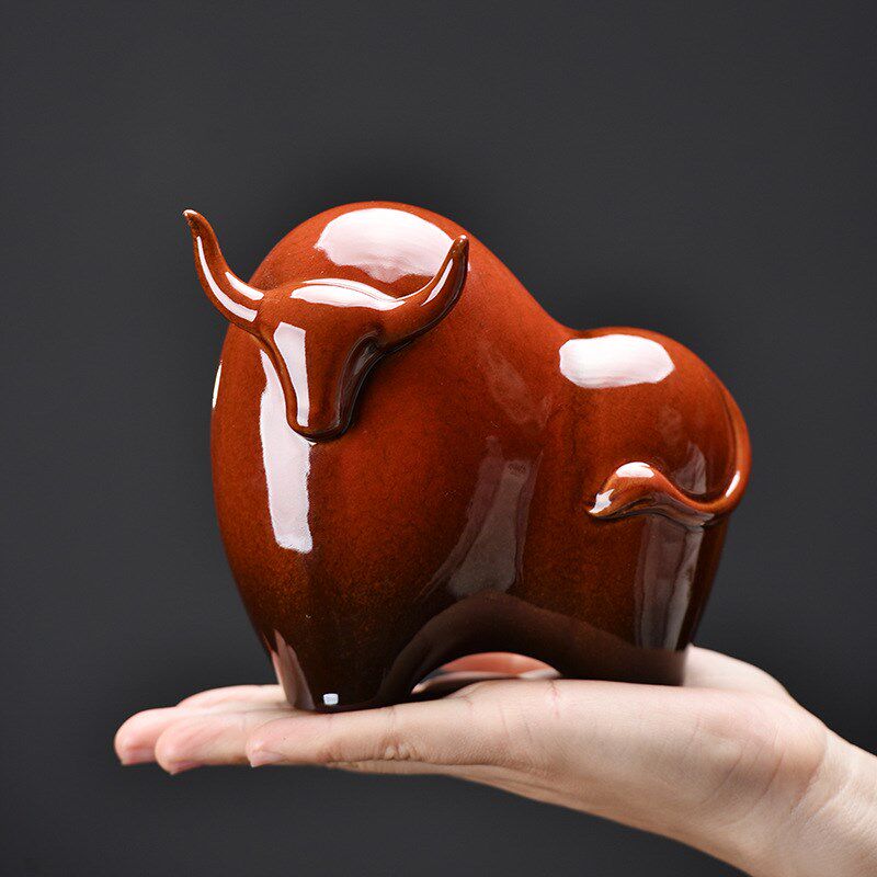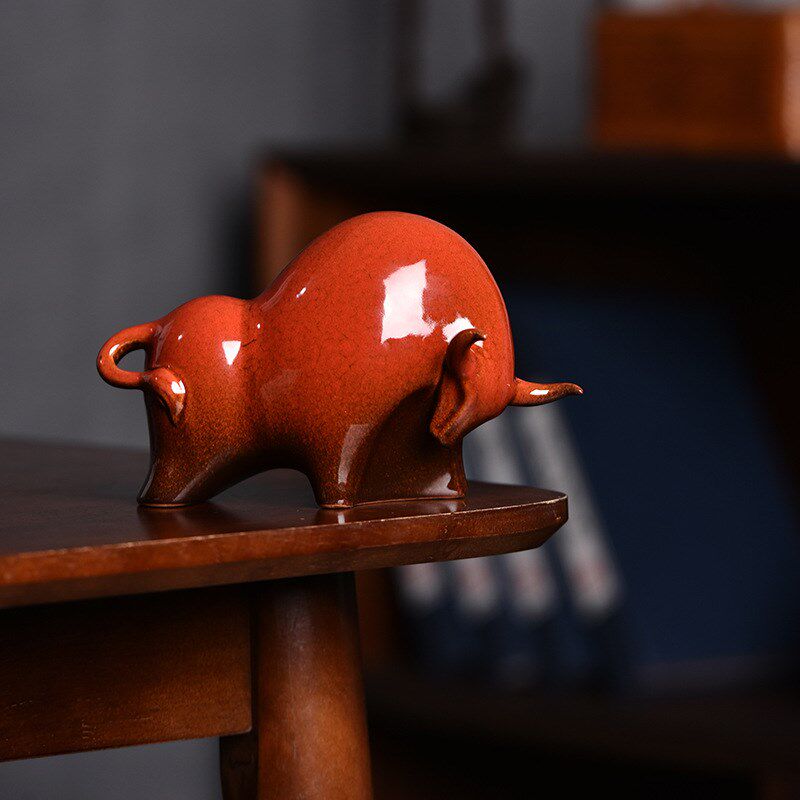 创意牛气冲天陶瓷红色牛摆件中式家居客厅招财装饰吉祥物酒柜摆设