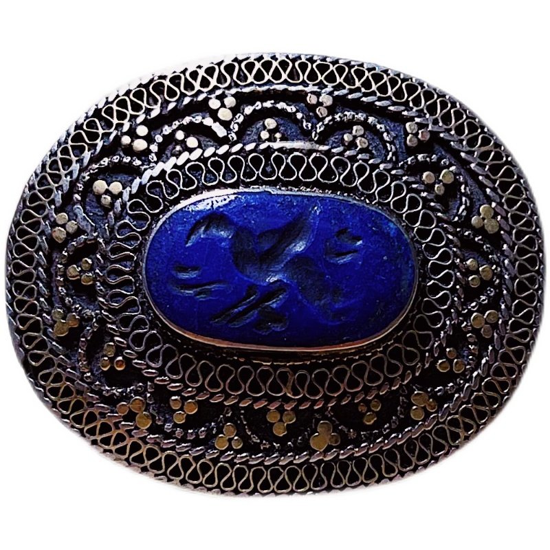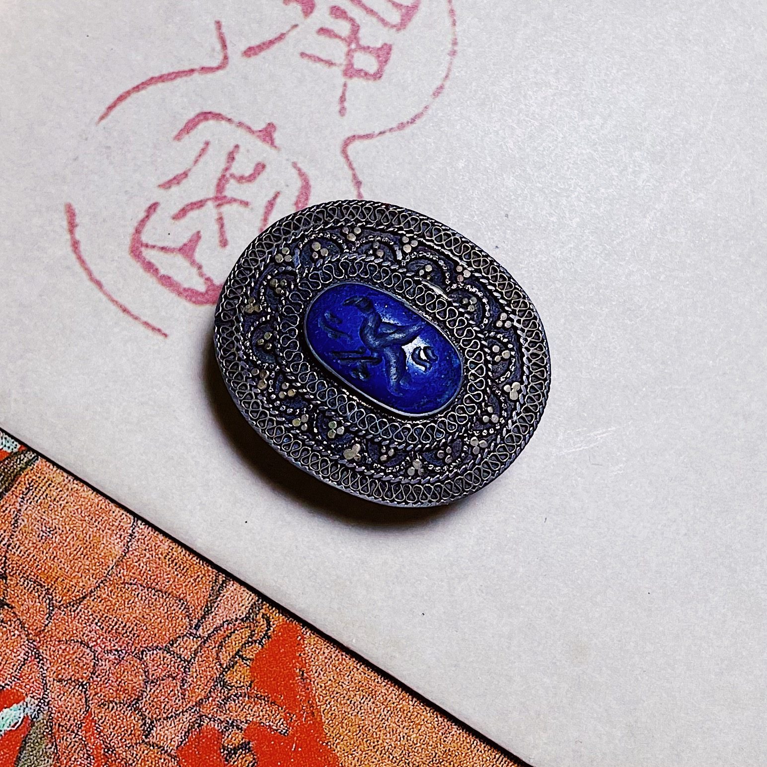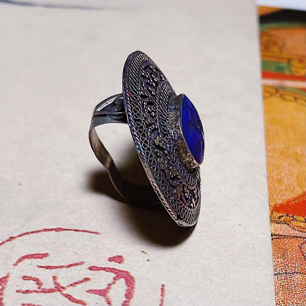 承李李原创设计 纯银镶嵌西亚老花押青金石水晶宝石 复古手工戒指