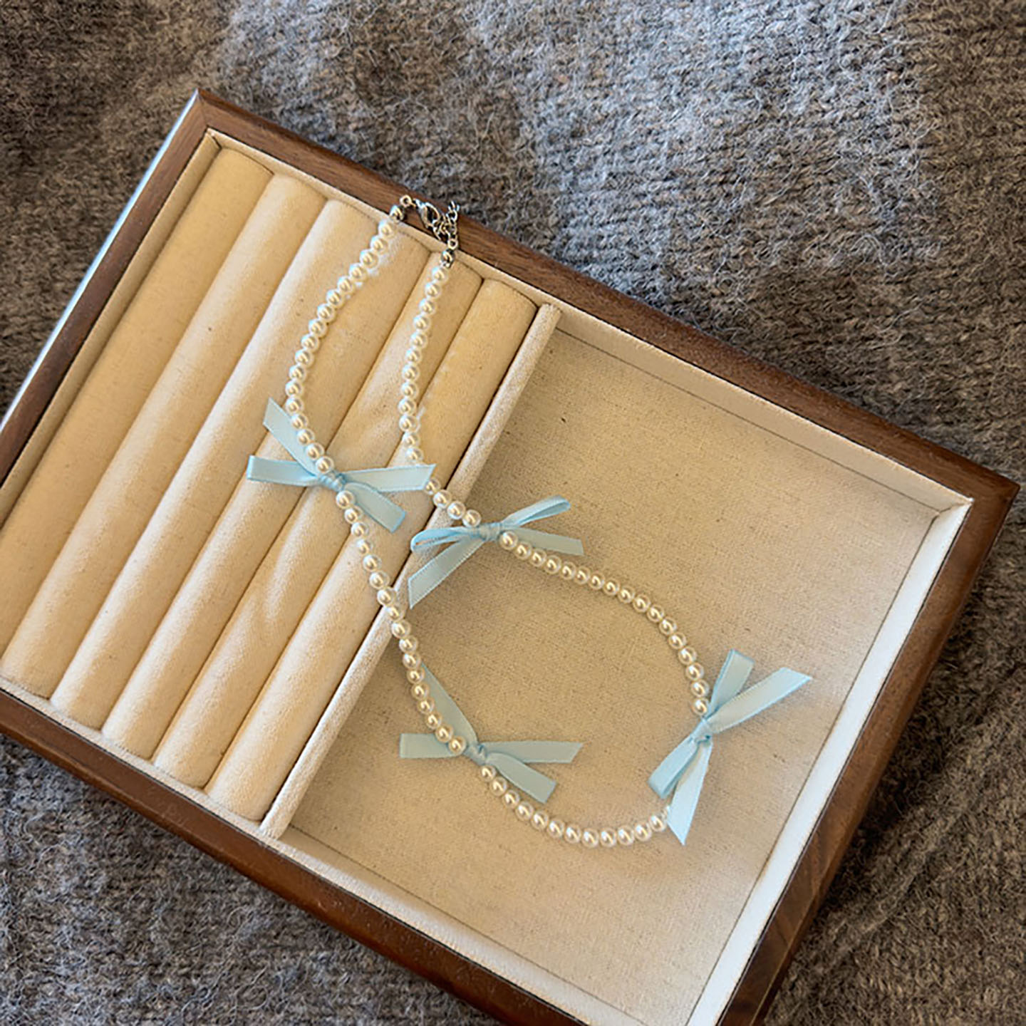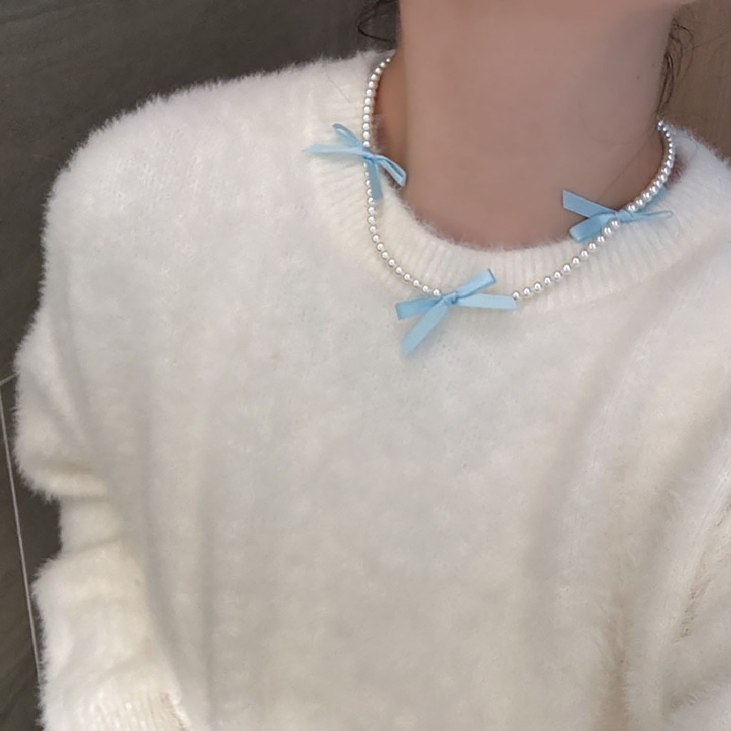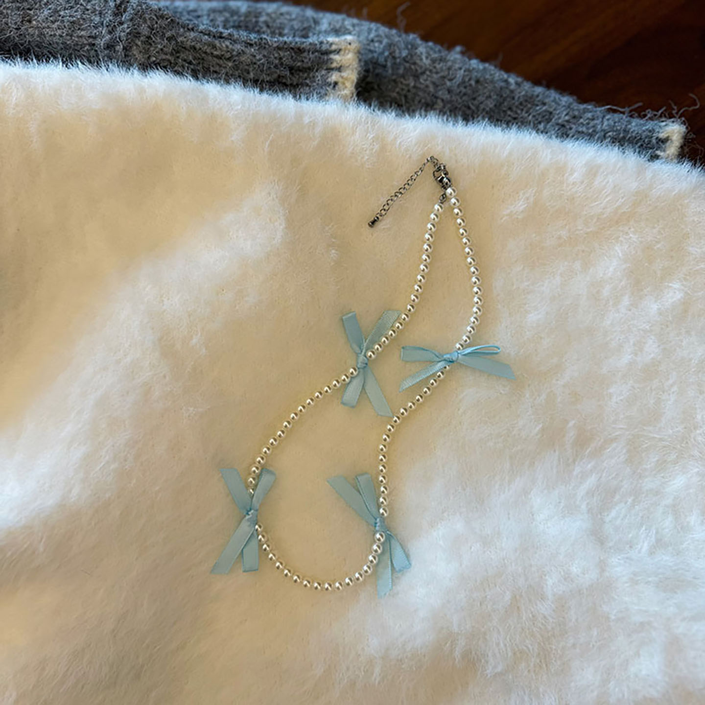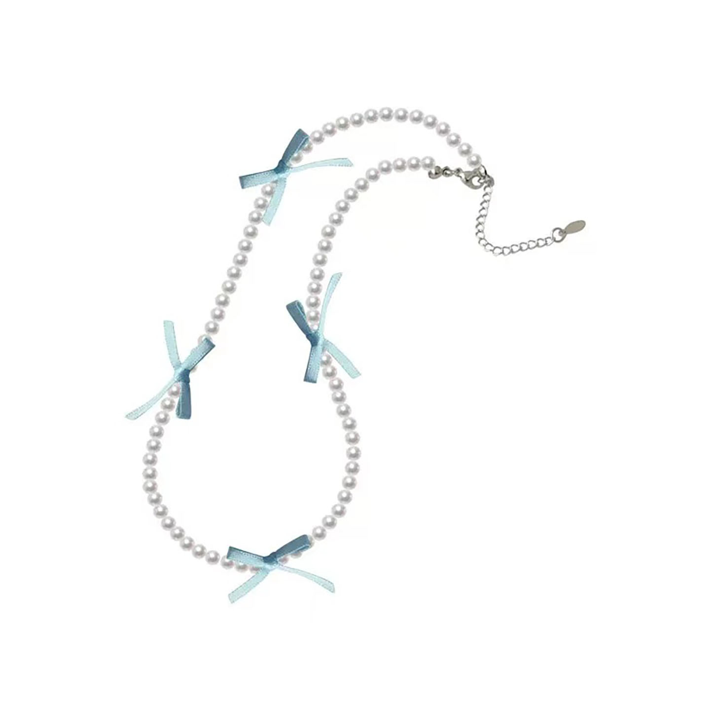 芭蕾风玻璃珍珠钛钢项链女蓝色丝带蝴蝶结锁骨链春夏秋季新款颈链