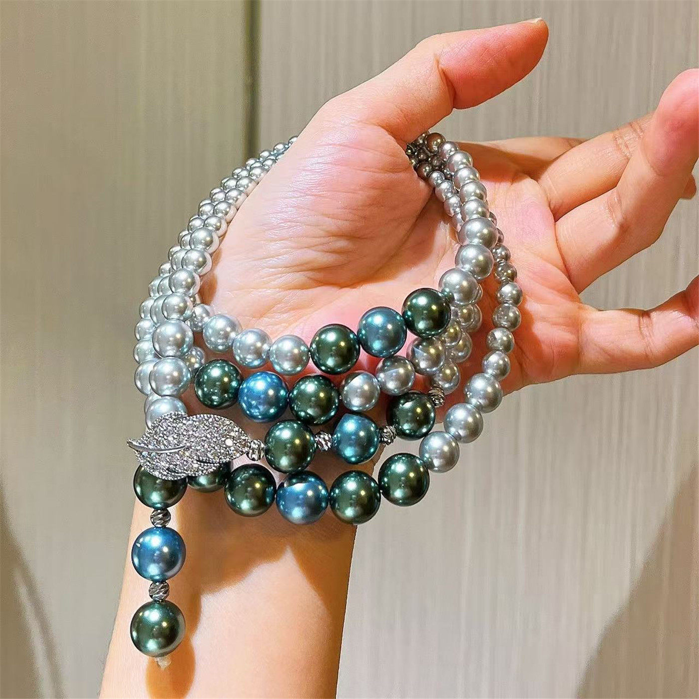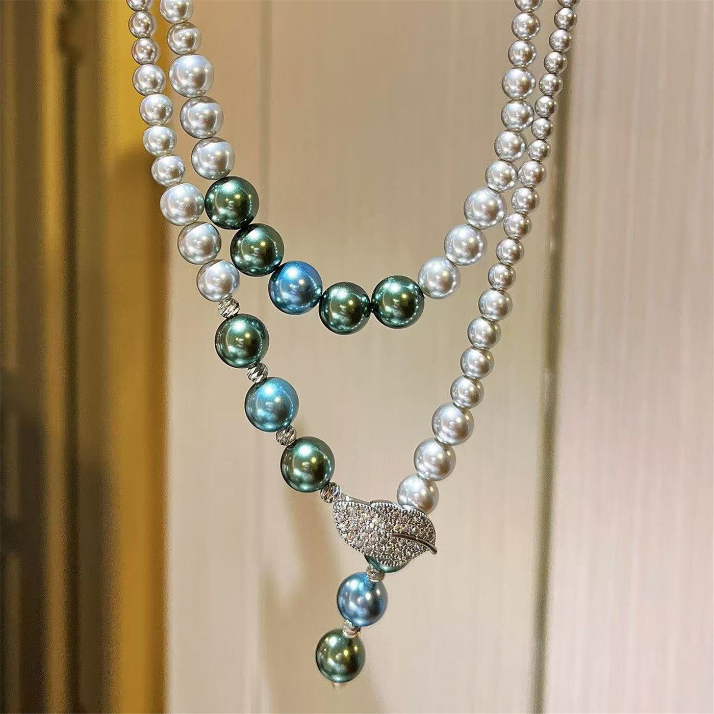 轻奢气质银灰色珍珠不规则混彩长项链满钻羽毛扣颈链多种戴法性感