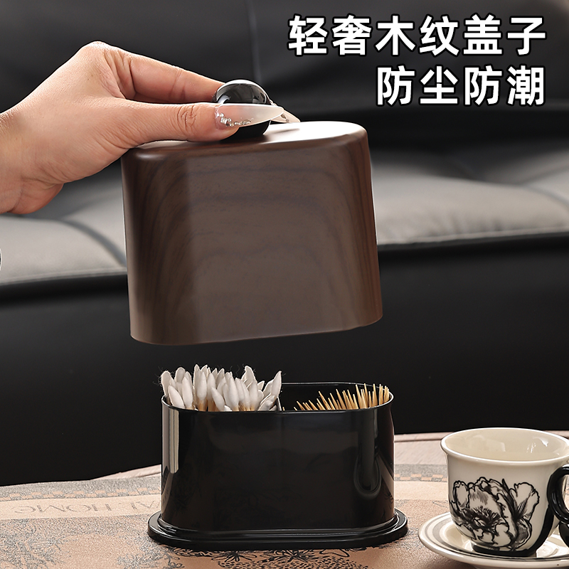 胡桃木纹牙签盒家用客厅分格牙签筒桌面茶几防尘牙线棉签收纳盒