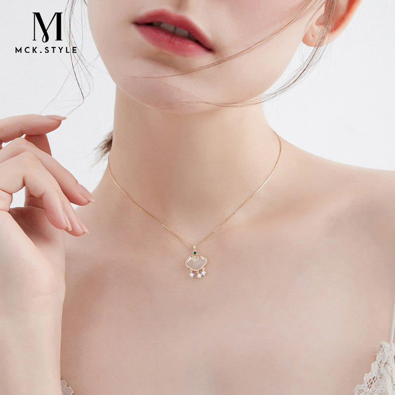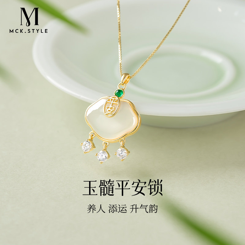 送妈妈母亲节生日礼物白色玉髓平安锁项链女款S925银锁骨链配饰
