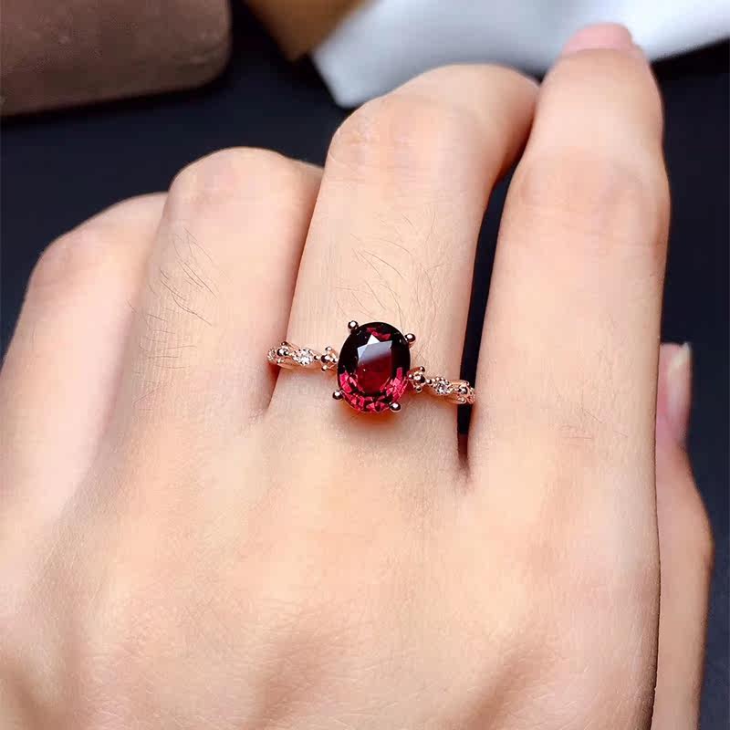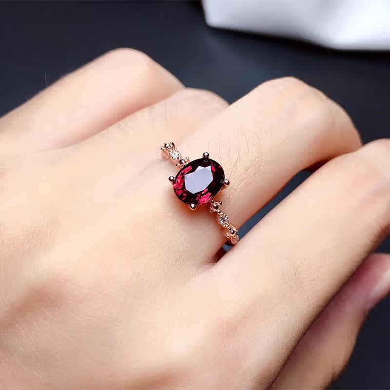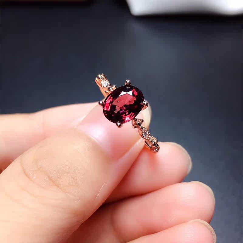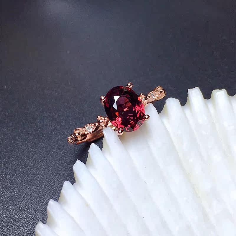 天然镁铝石榴石戒指女925纯银18K玫瑰金红色宝石女戒简约开口证书