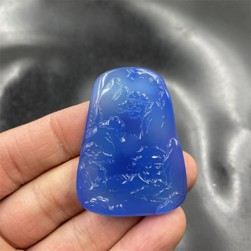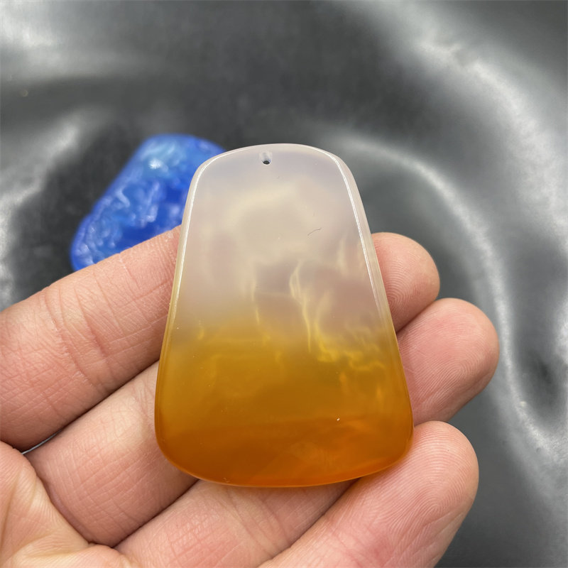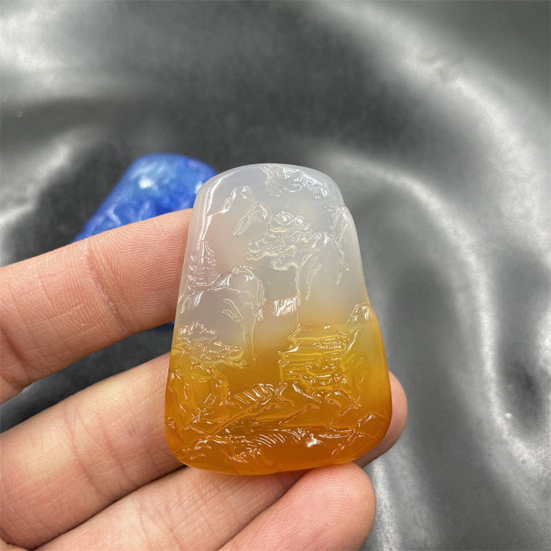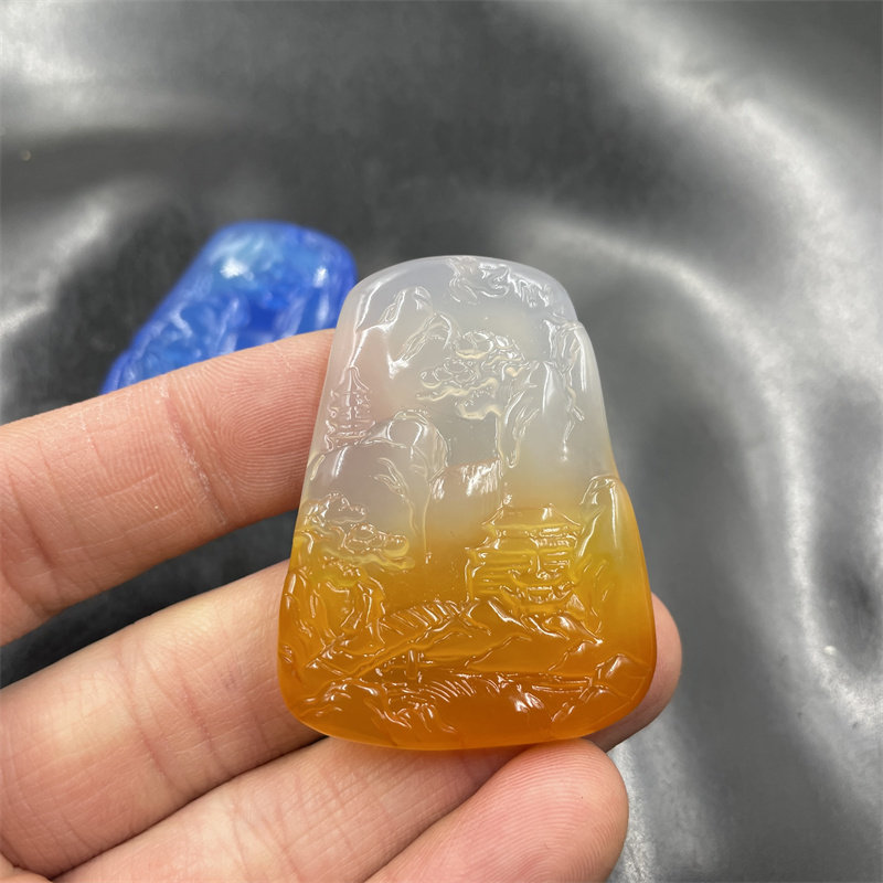 四海玉器 天然正品蓝玉髓山水牌子 半黄色玛瑙山水毛衣链挂件