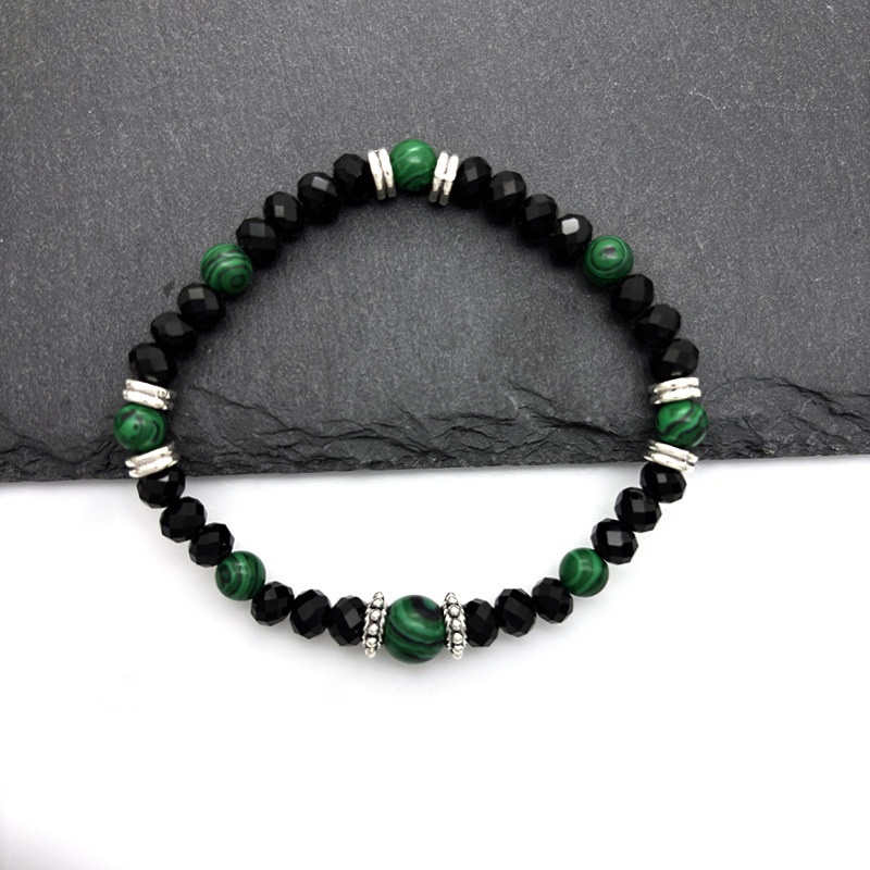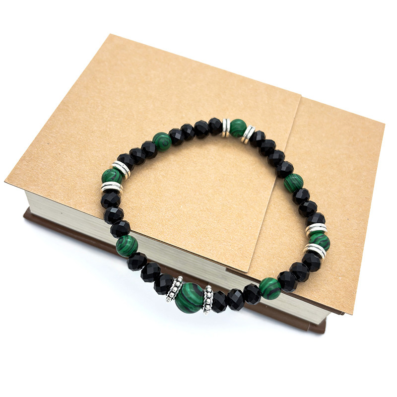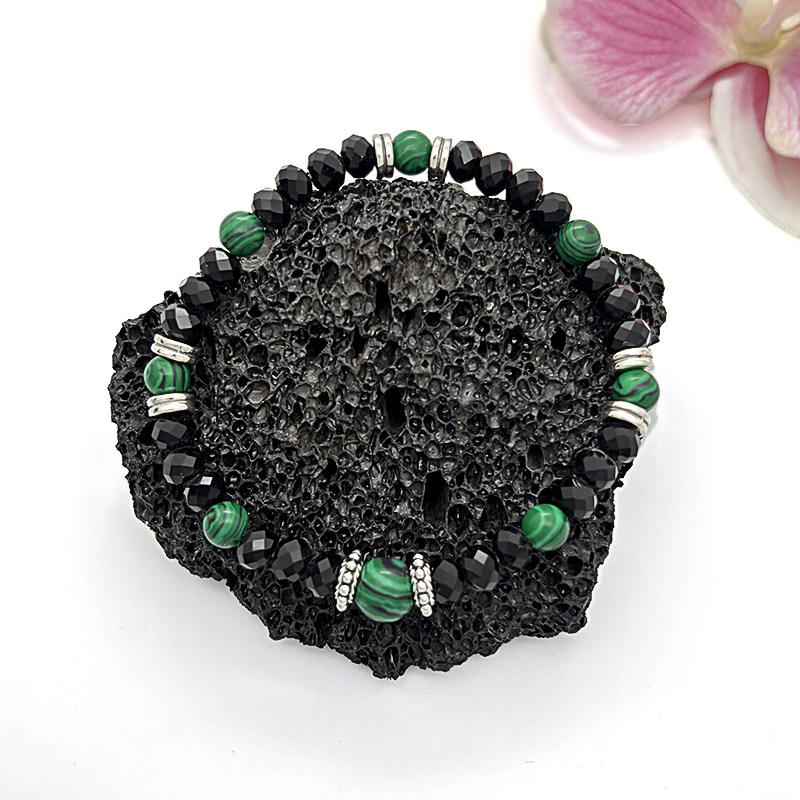 简约孔雀石雪花隔片黑色切面水晶串珠弹力手链