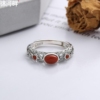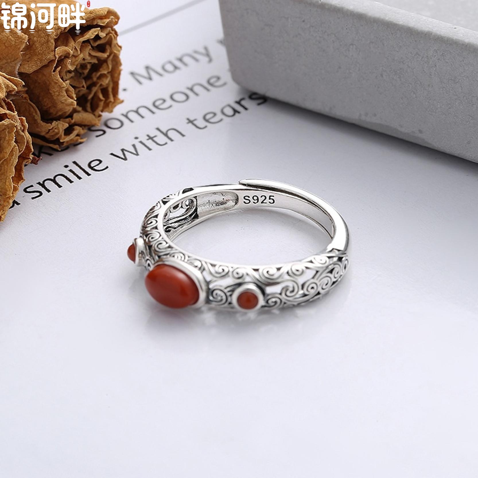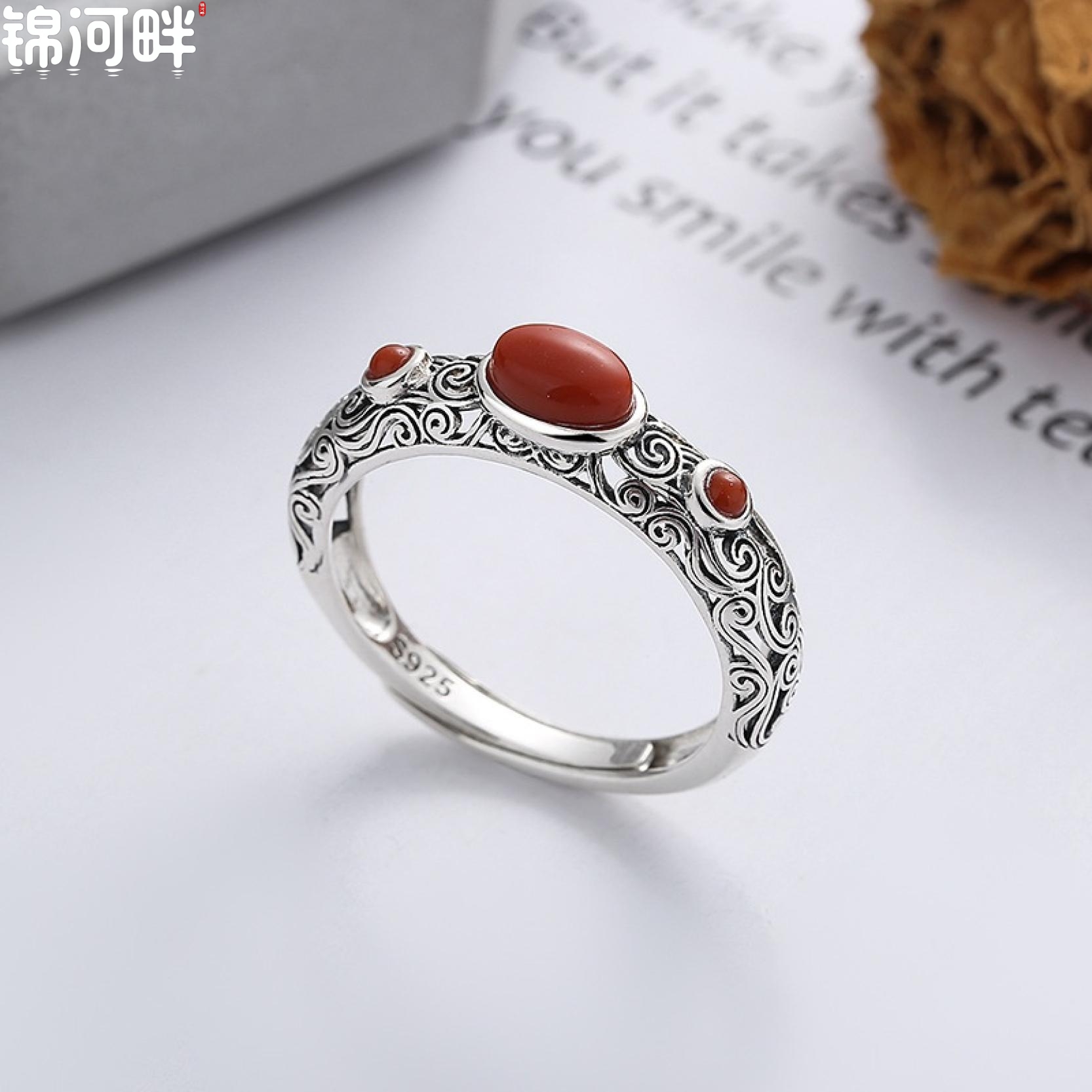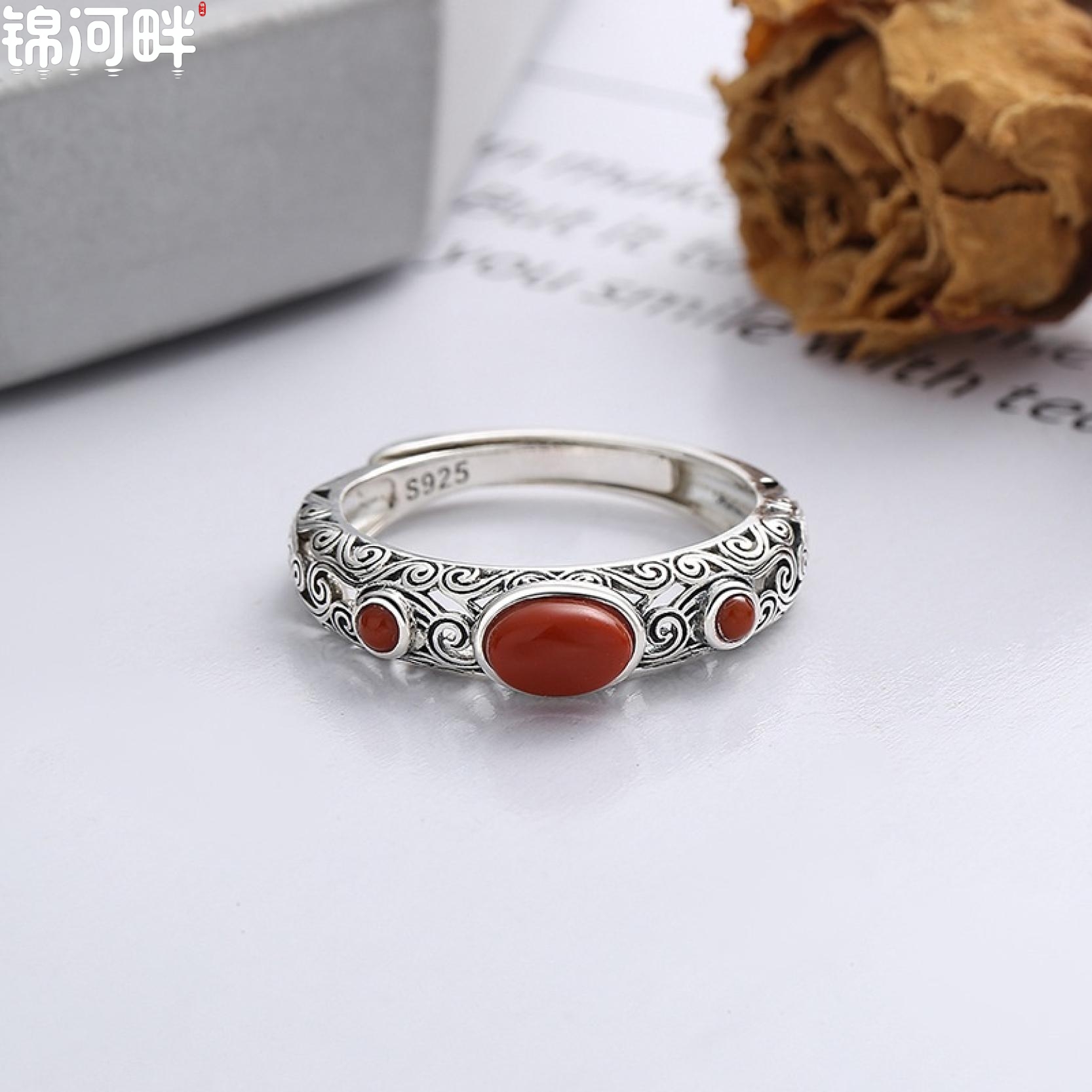 锦河畔 s925纯银复古做旧工艺花纹点缀南红色玛瑙文艺气质开口