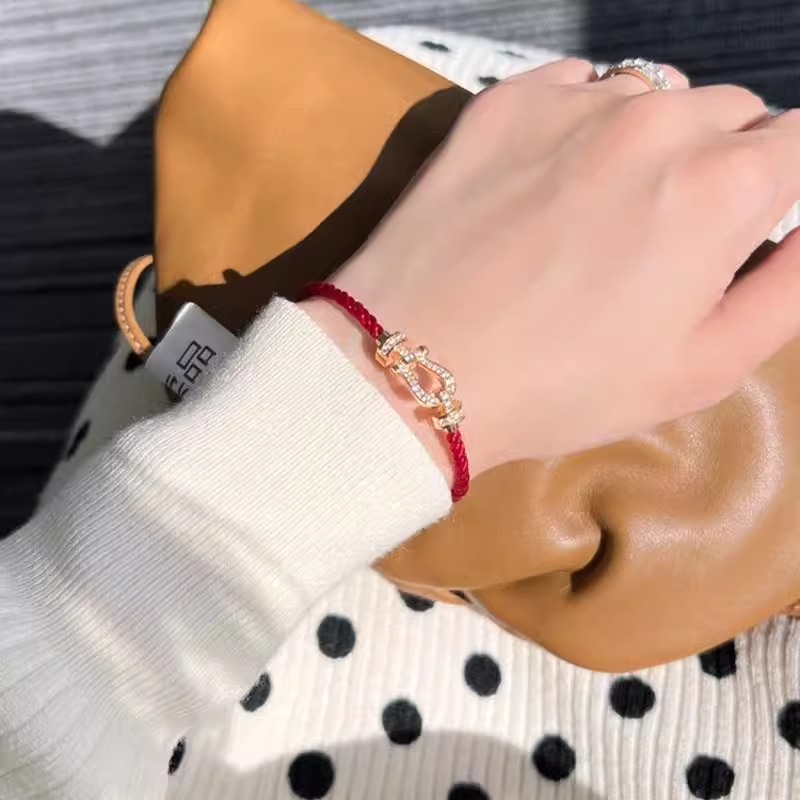 明星同款18k玫瑰金马蹄扣红绳手链女满钻轻奢本命年转运情侣手饰