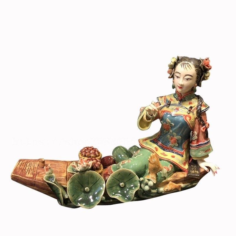 石湾陶瓷公仔顺利船荷叶仕女手工摆件门客厅酒柜博古架餐厅渔船女
