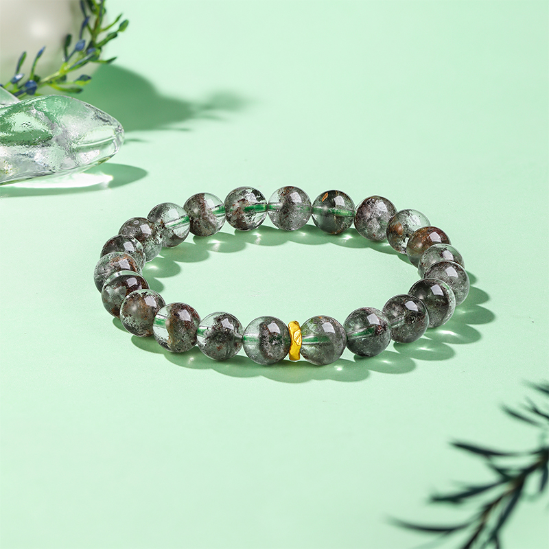 六桂福珠宝绿幽灵水晶手串女招财转运手链足金正品真金生日礼物
