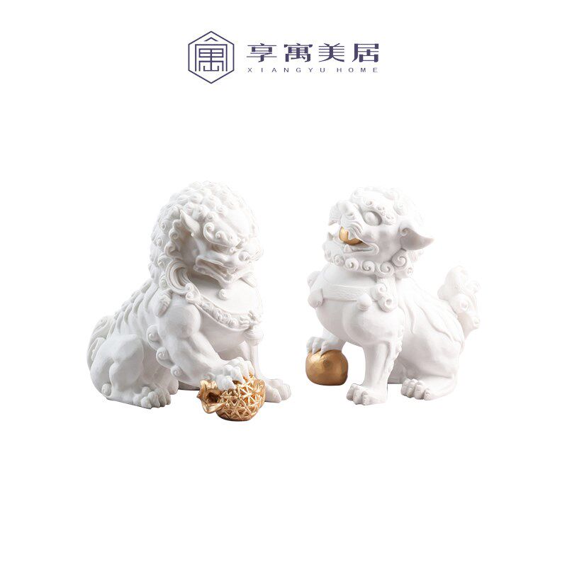 新中式轻奢白色狮子摆件样板间客厅D书房玄关博古架家居装饰工艺