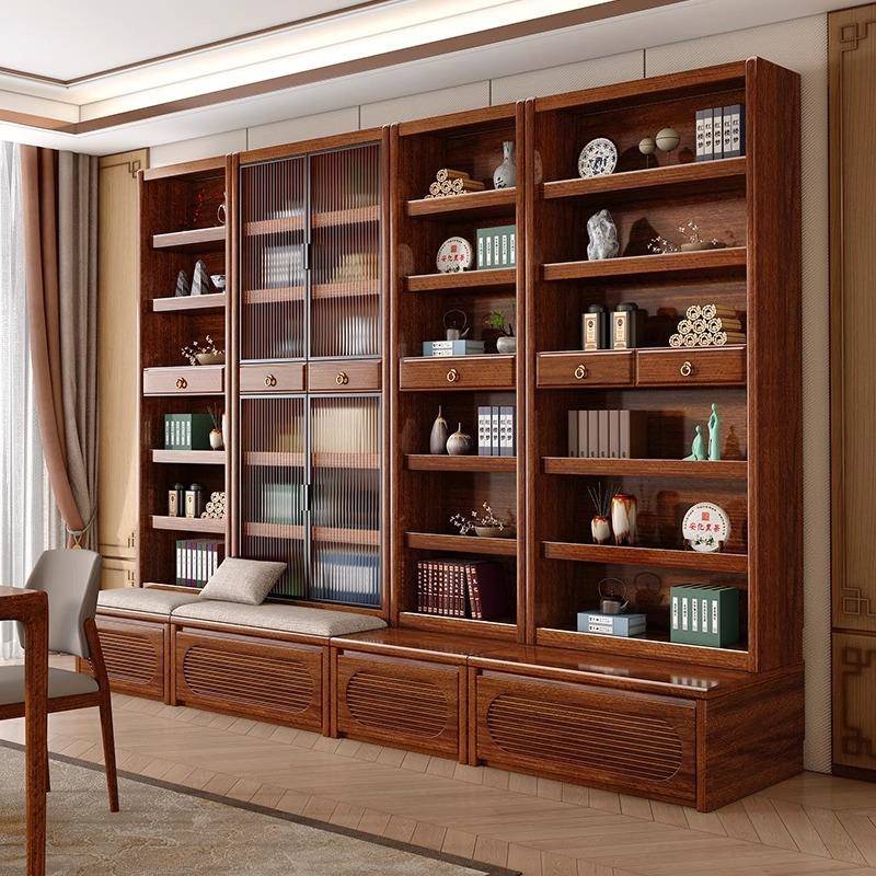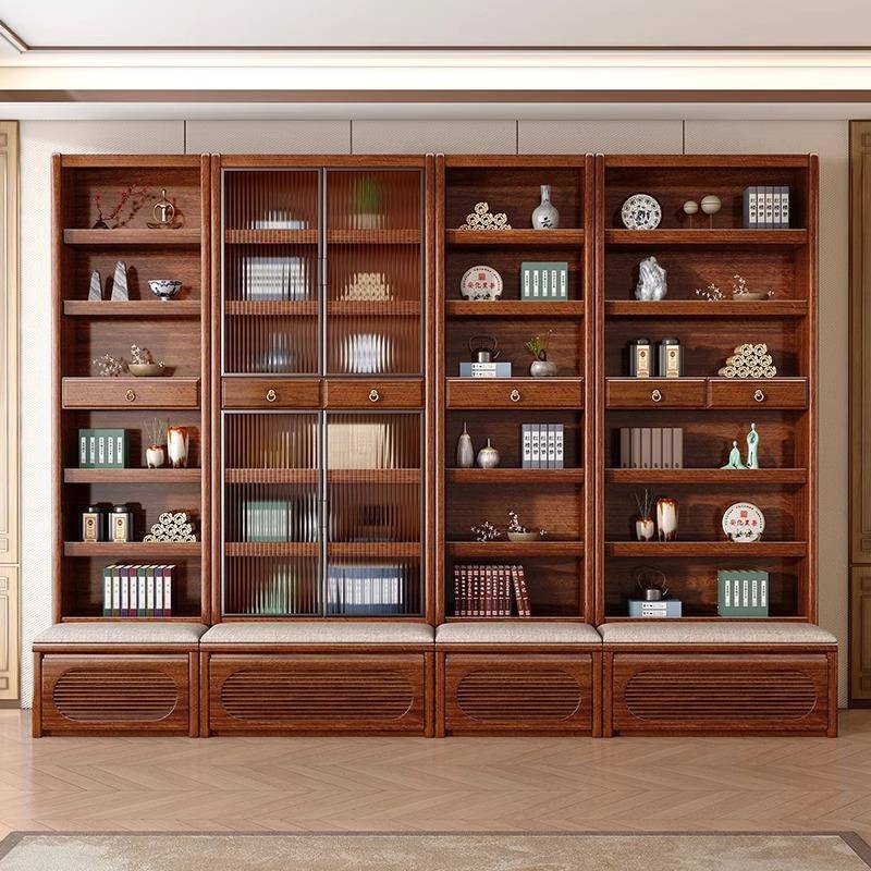 胡桃木全实木书柜带玻璃门自由组合书橱多功能靠墙立柜展示收纳柜