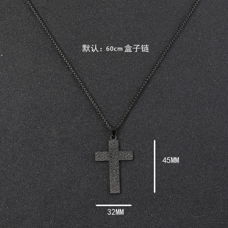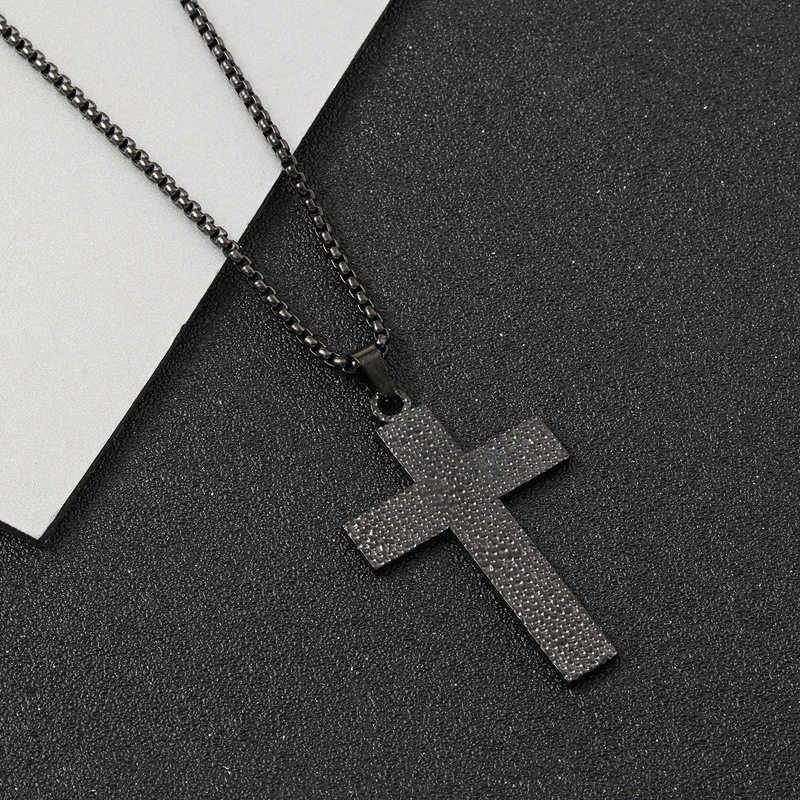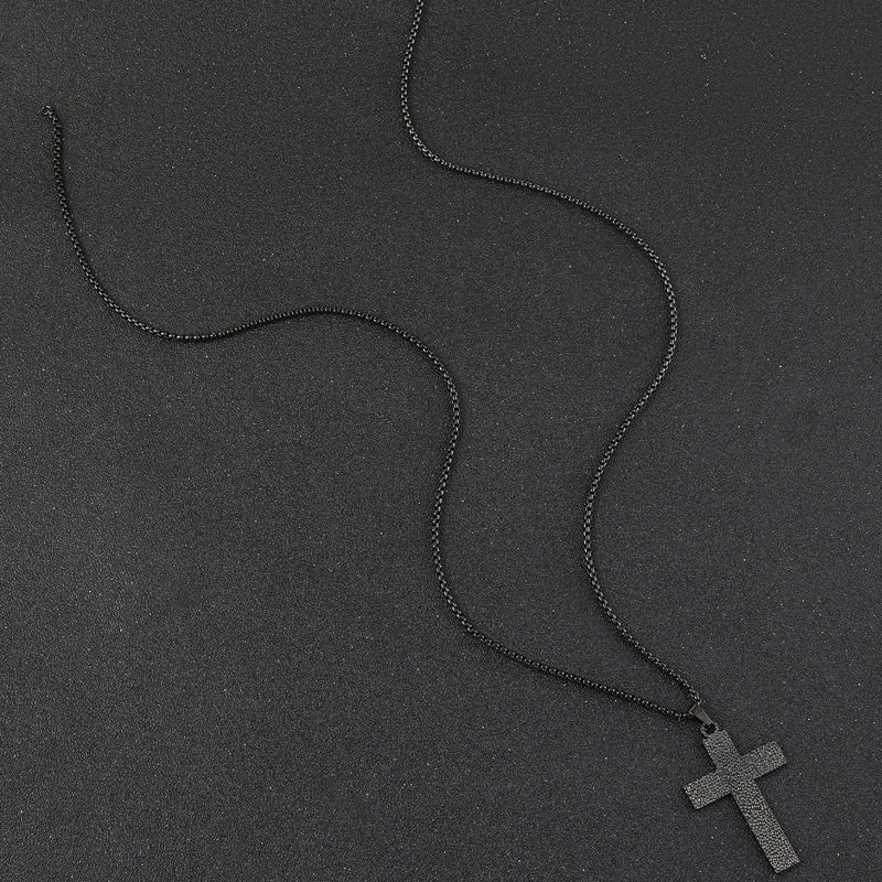 欧美跨境百搭供应 饰品切割十字架形状黑色油压肌理纹钛钢项链女