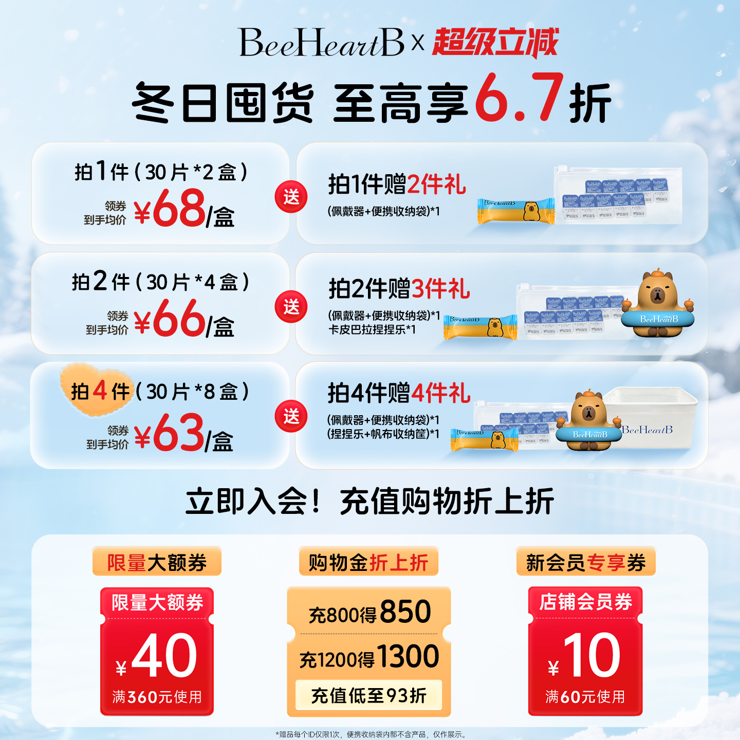 【2盒囤货装】BeeHeartB日抛60片38%/55%含水隐形眼镜透明蜜心妍