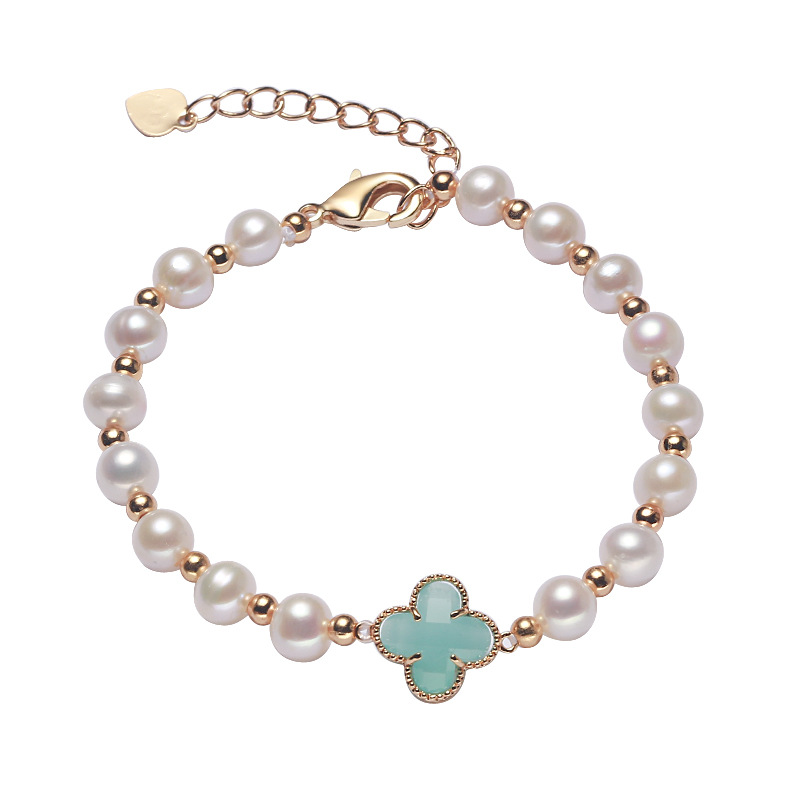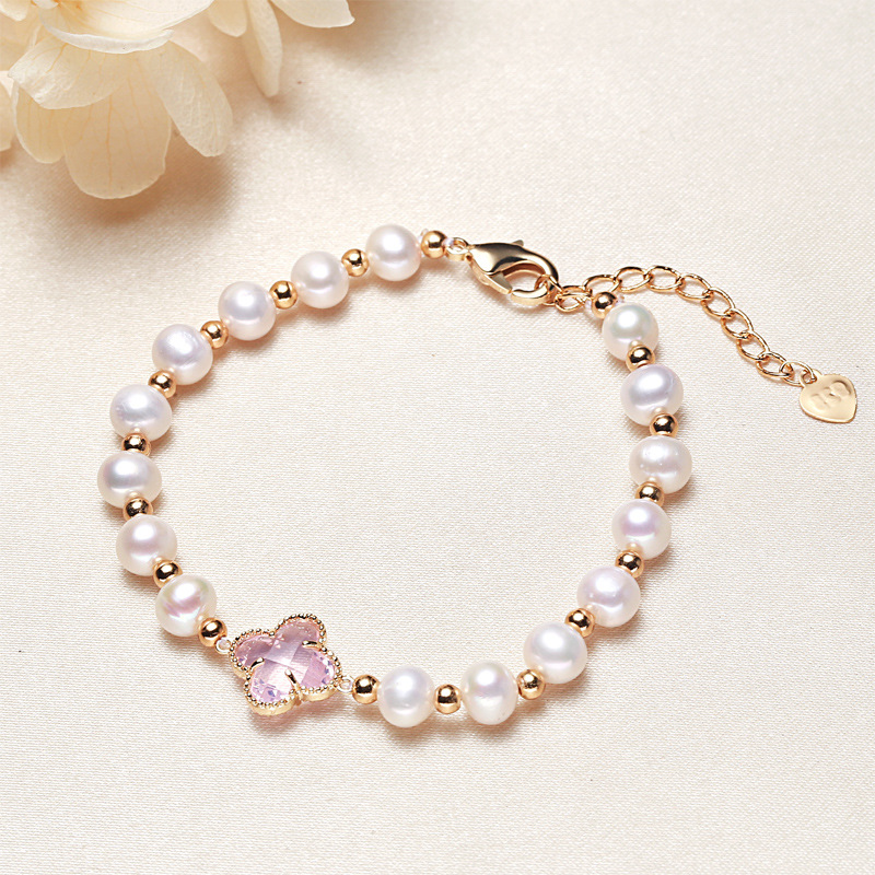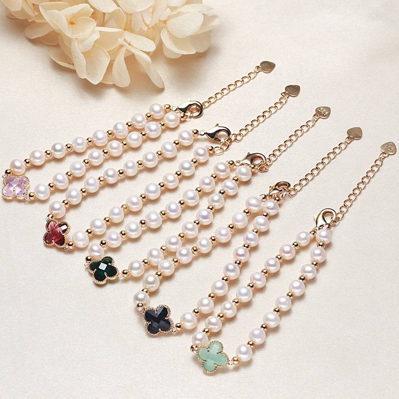 5mm近圆白色珍珠铜镀金色诸暨巴洛克首饰四叶草淡水珍珠手链女