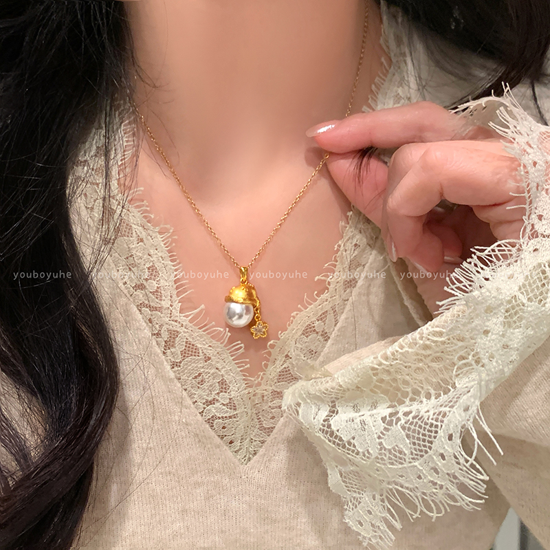 圣诞许愿帽~金色拉丝珍珠吊坠项链女小众设计气质新款毛衣链配饰