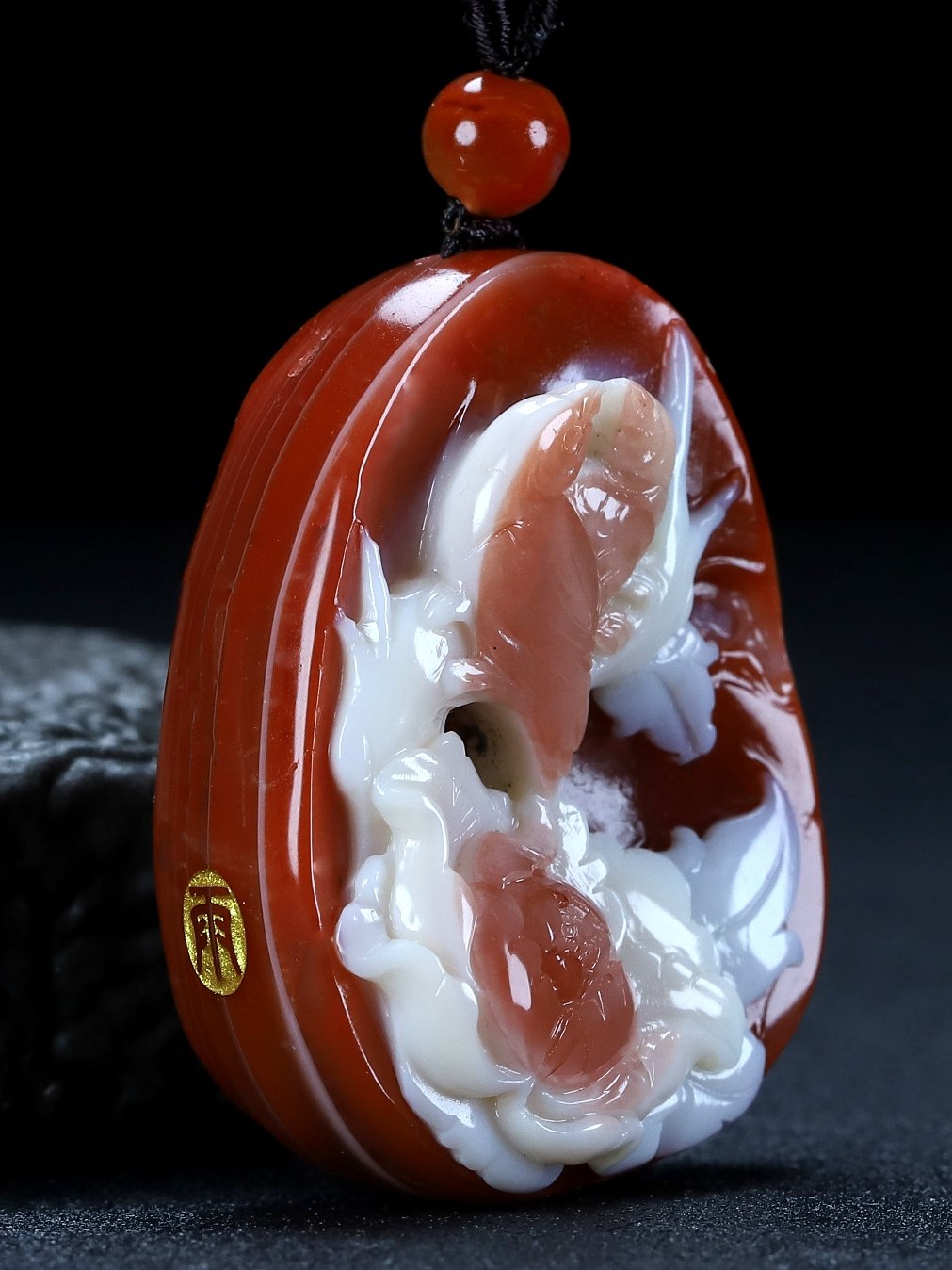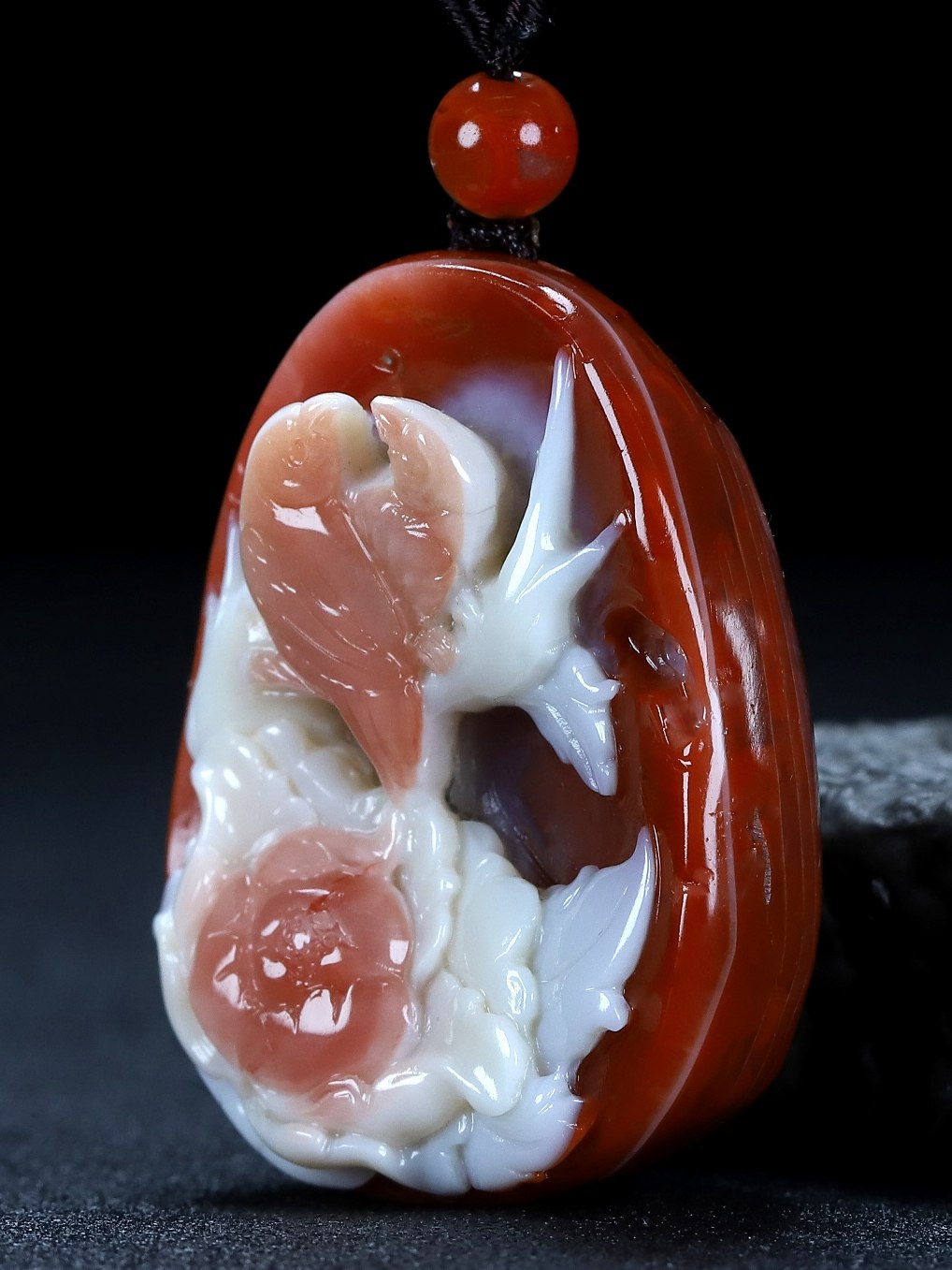 墨雨轩天然凉山南红玛瑙柿子红 花鸟 相亲相爱吊坠挂件男女款77号