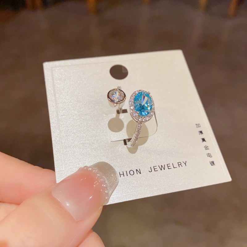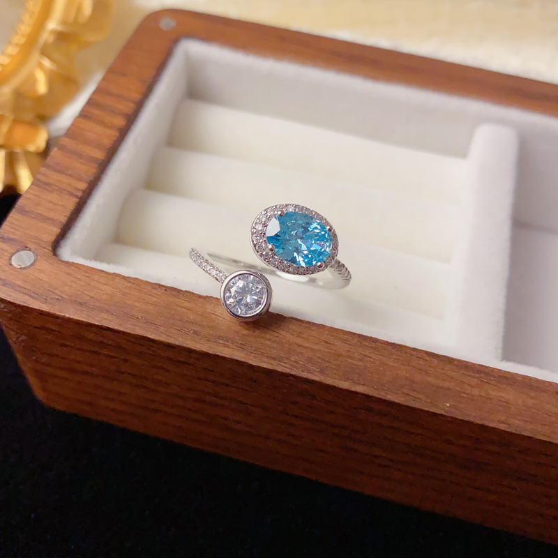 小众时尚简约银色满钻蓝色开口可调节戒指个性中指水晶食指环饰品