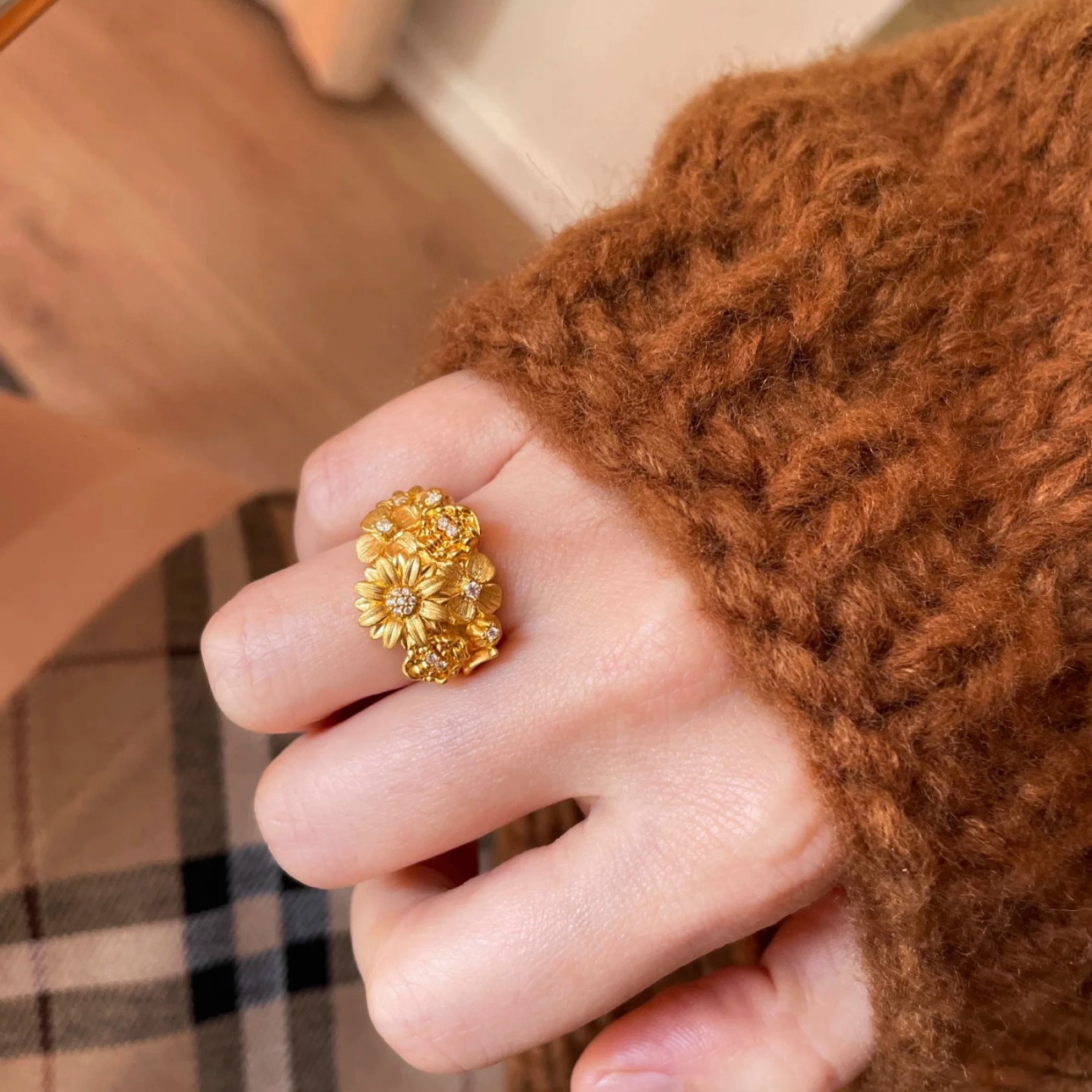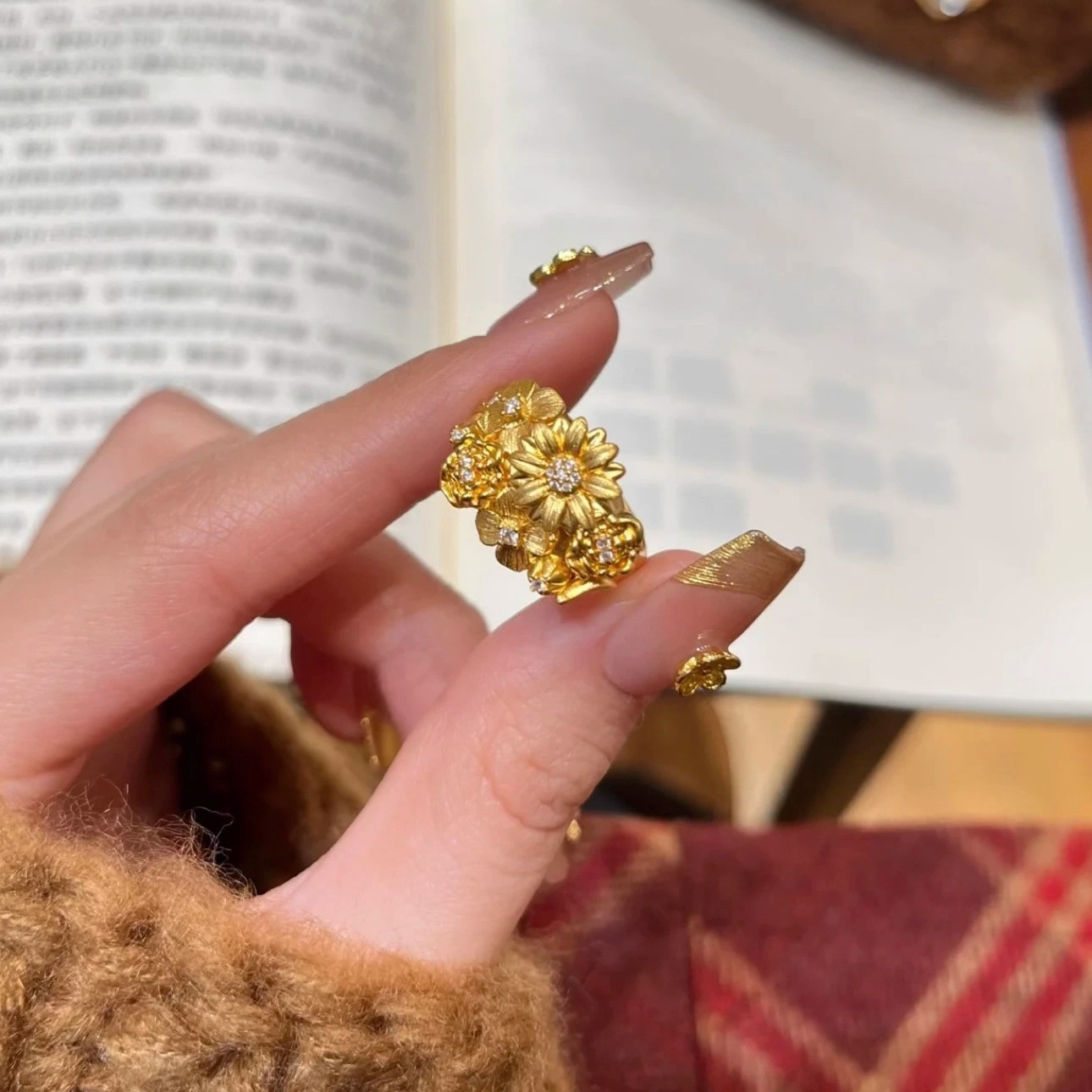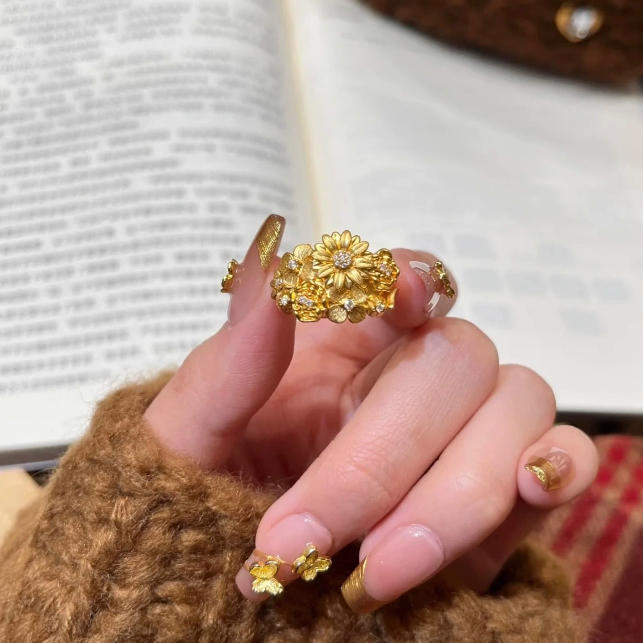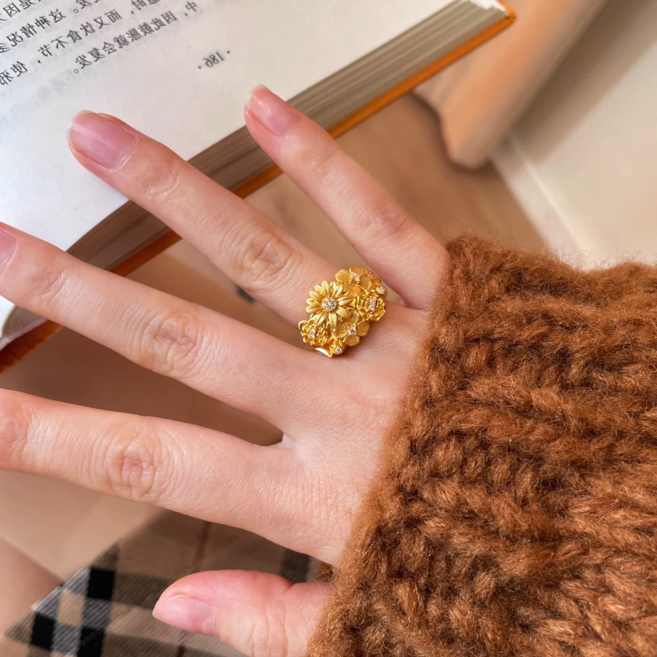 2025新款雏菊花朵戒指女爆款轻奢高级感沙金黄色镶钻锆石食指戒环