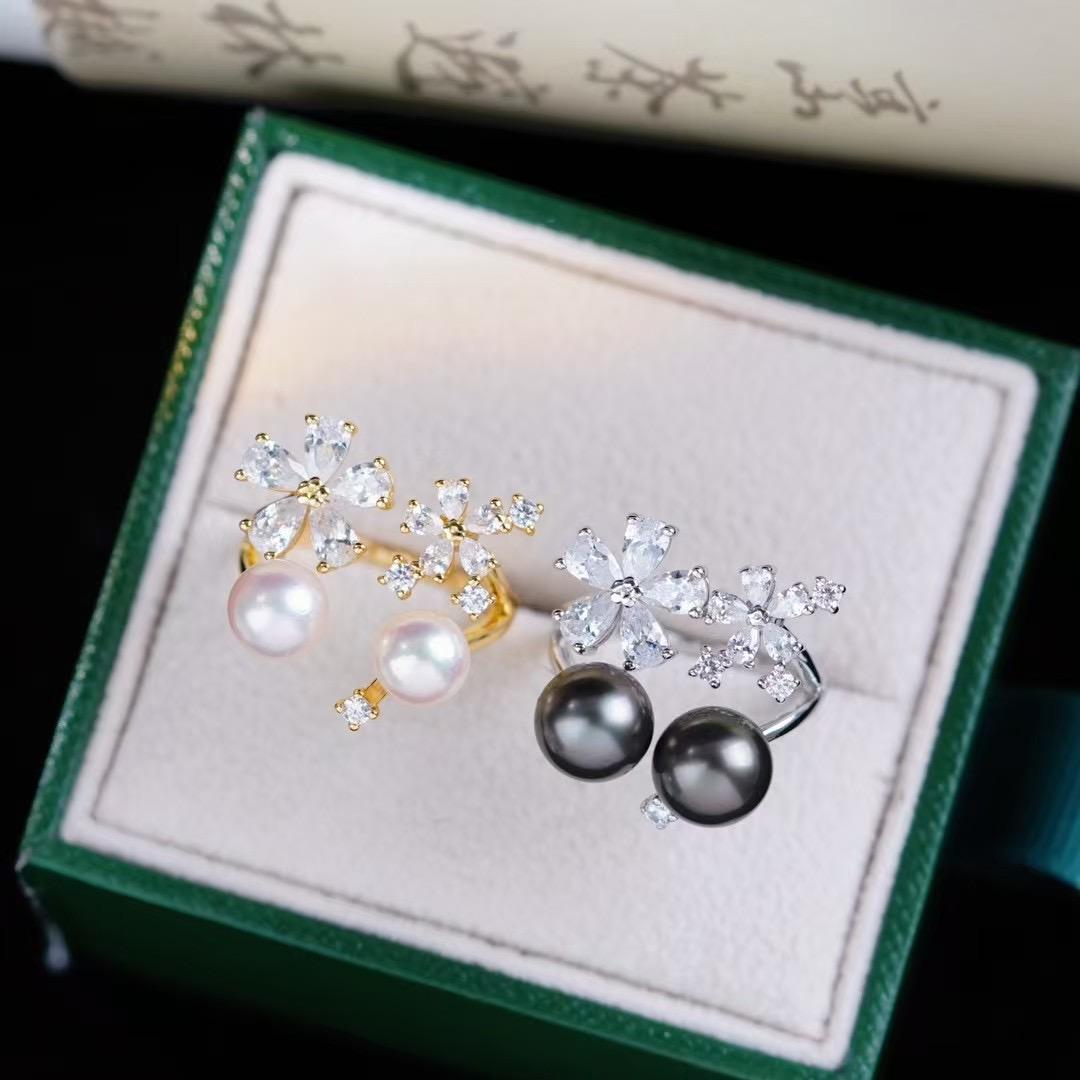 s925纯银戒指环 银饰双珠可调节珍珠戒指托DIY手工制作银配件空托