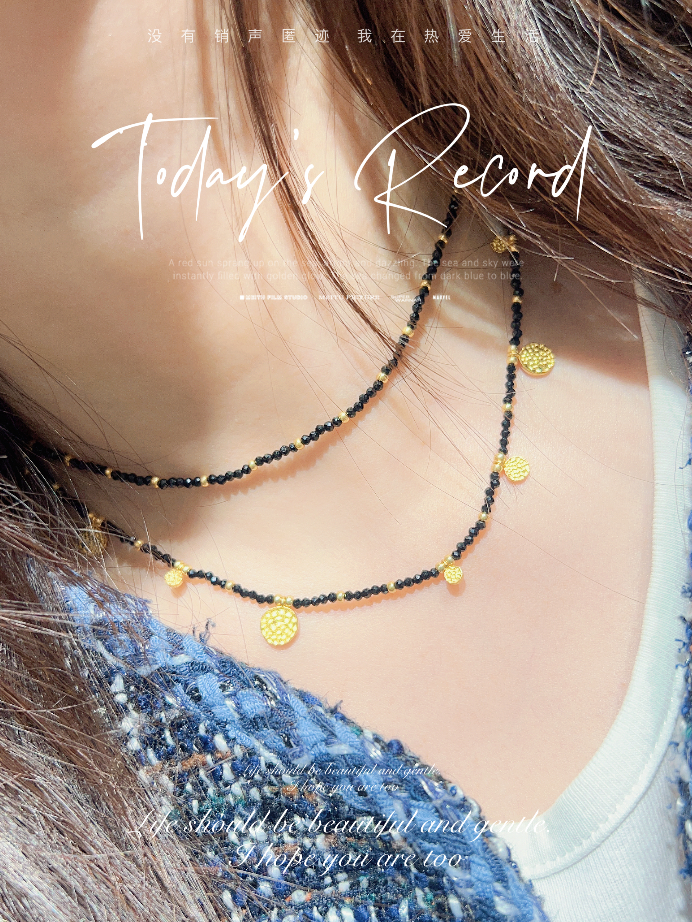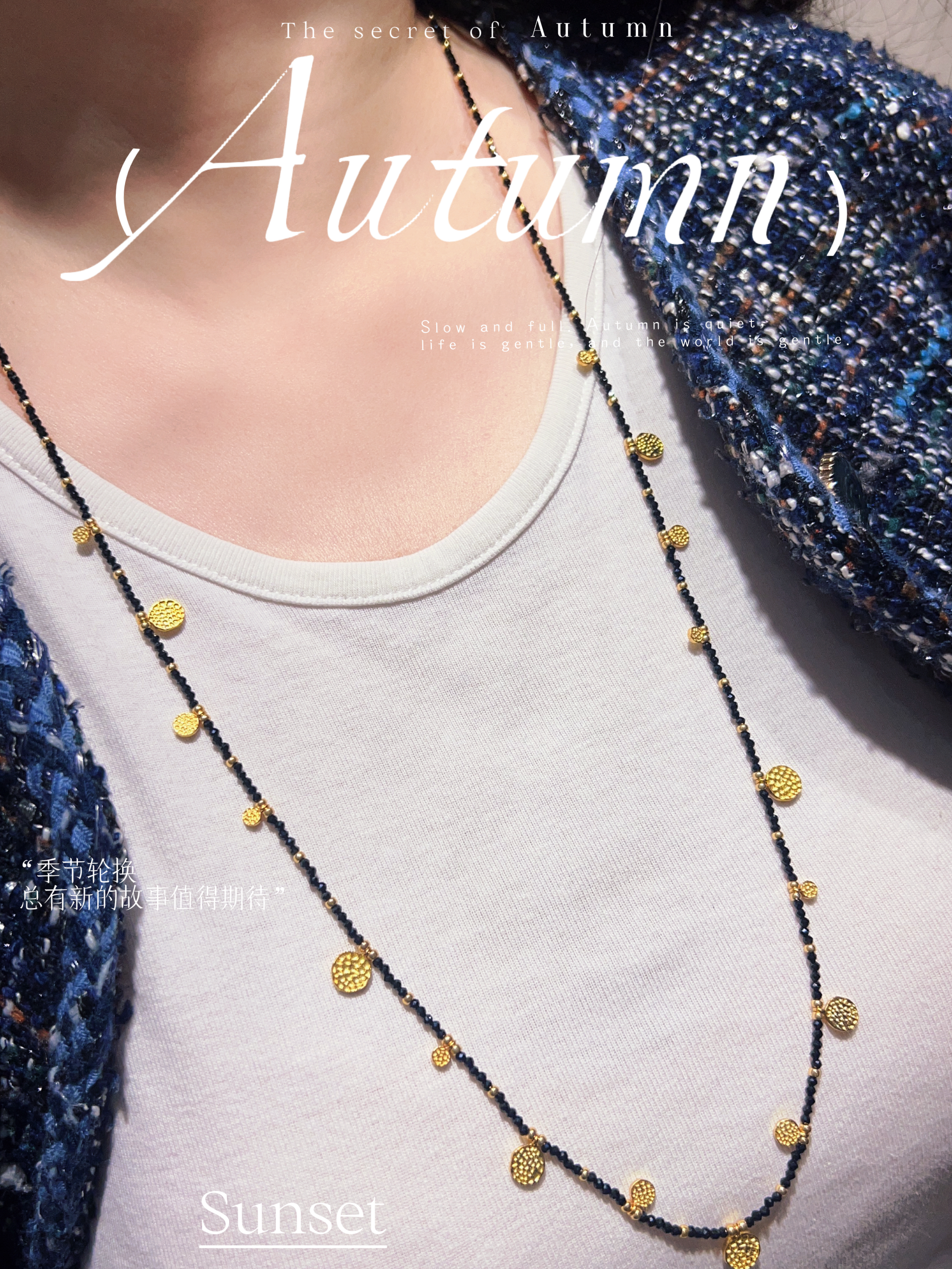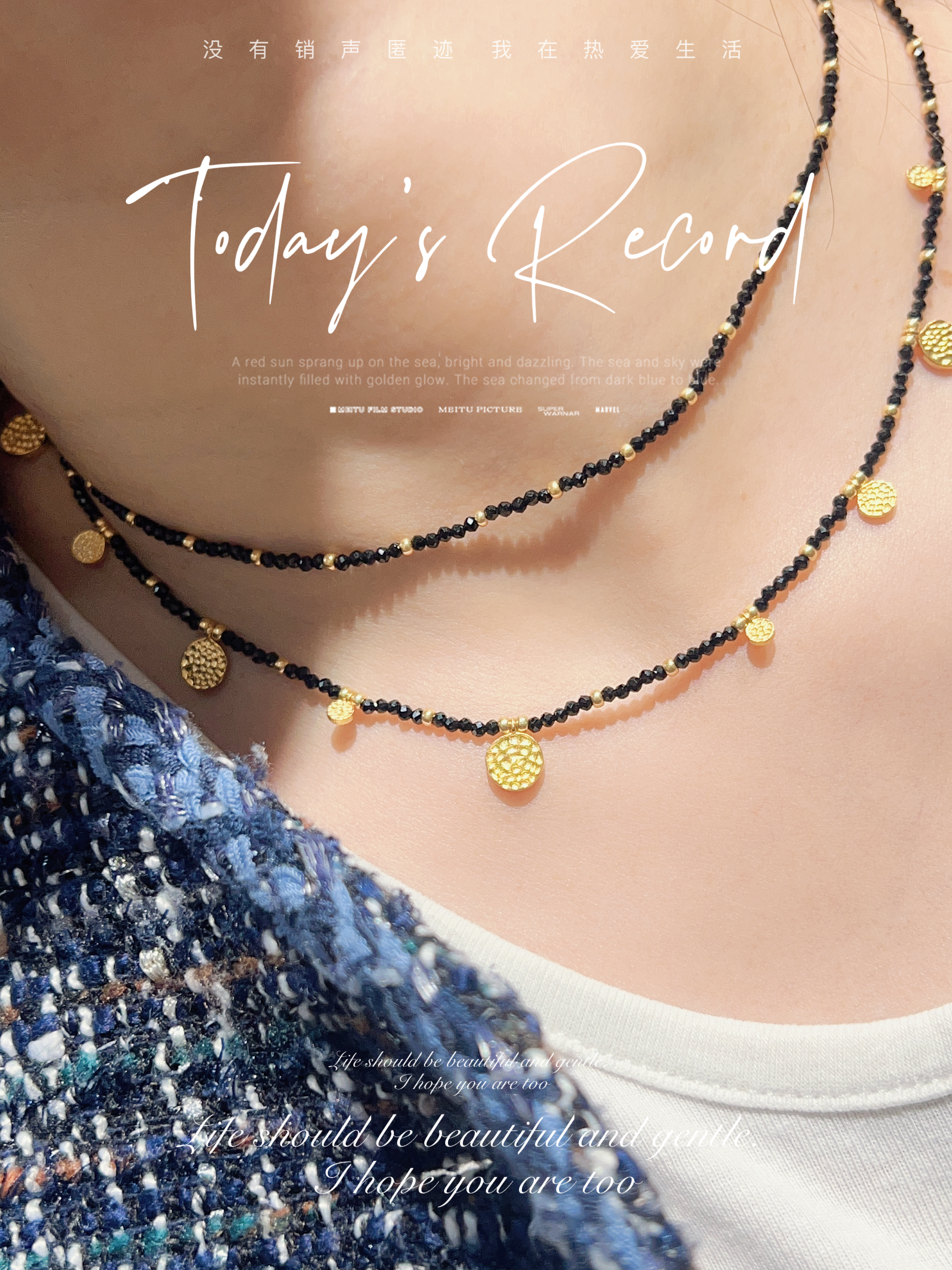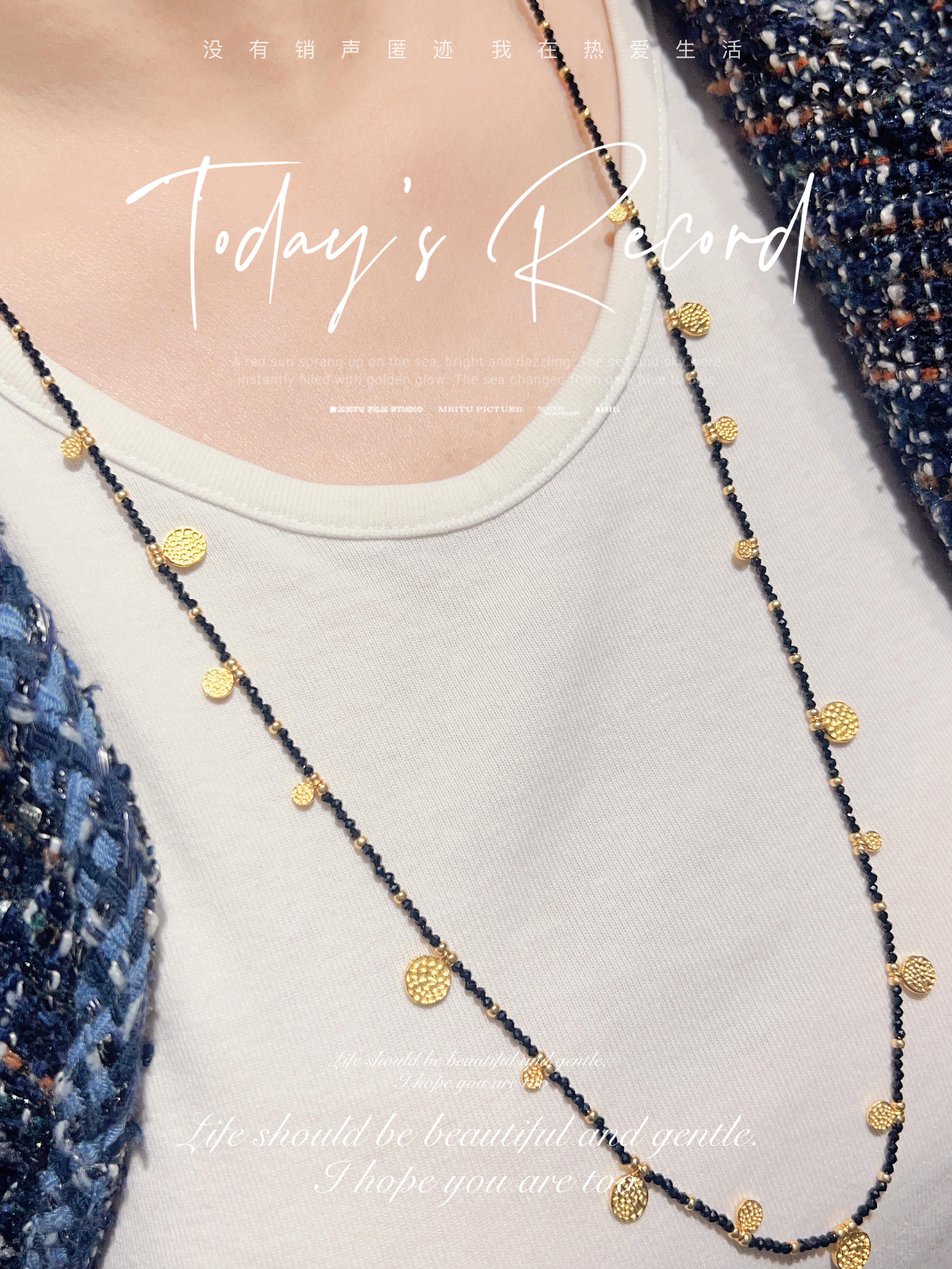 法式长款毛衣链黑色天然石项链给尖晶石双面捶打纹吊坠叠戴锁骨链